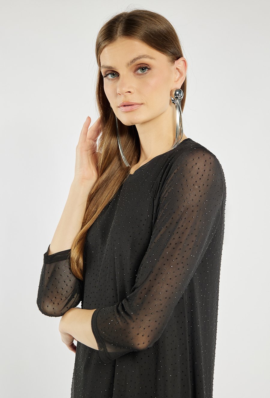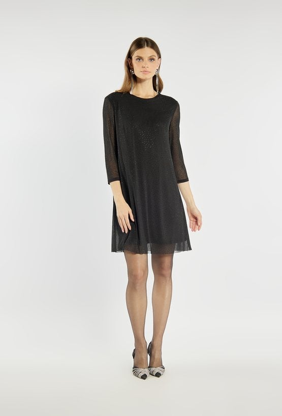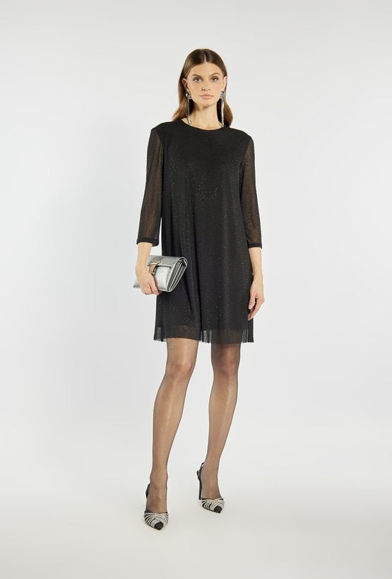 Sukienka o luźnym, zwiewnym kroju, wykonana z delikatnej, lekko transparentnej tkaniny z subtelnym połyskiem. Rękawy 3/4 i lekko rozkloszowany dół nadają jej lekkości i elegancji. To doskonała propozycja na święta, sylwestra lub inne wyjątkowe okazje. Modelka na zdjęciu ma 177 cm wzrostu i prezentuje rozmiar 36.