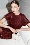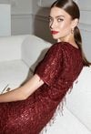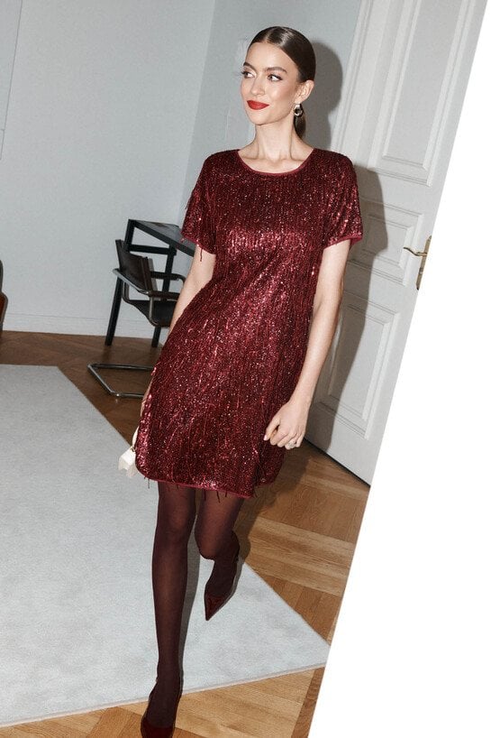 Krótka, efektowna sukienka o prostym kroju. Sukienka w całości ozdobiona połyskującymi cekinami i subtelnymi frędzlami, które pięknie poruszają się przy każdym ruchu, dodając kreacji lekkości i trójwymiarowego blasku. Model z krótkim rękawem i delikatnym zapięciem z tyłu na guzik zachwyca elegancją i komfortem noszenia. Idealna propozycja na wyjątkowe okazje- sylwestra, bal lub wieczorne wyjście. Modelka na zdjęciu ma 177 cm wzrostu i prezentuje rozmiar 36.
