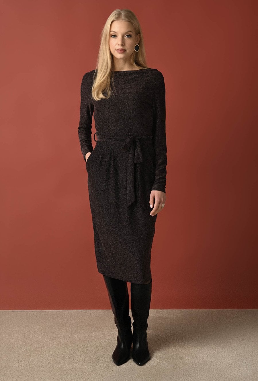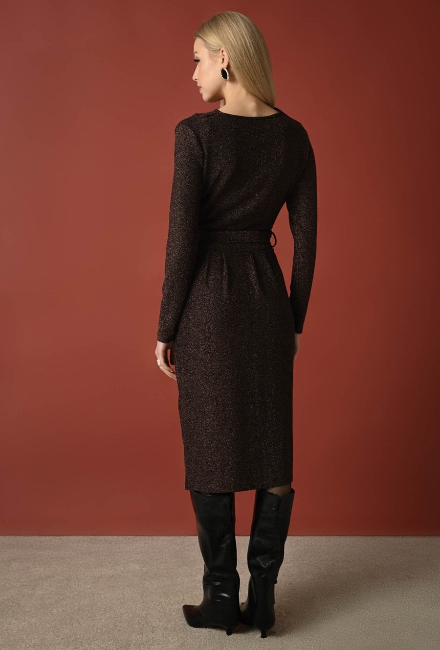 Kobieca, dopasowana sukienka w czekoladowym kolorze z połyskującą nicią będzie doskonałym wyborem na specjalne okazje i rodzinne przyjęcia. Okrągły dekolt oraz wiązanie w tali sprawiają, że sukienka jest zarówno zmysłowa, jak i kobieca, a przylegający fason pięknie podkreśla sylwetkę. To bez wątpienia model z efektem "wow" z naszej najpiękniejszej kolekcji EVENING! Modelka na zdjęciu ma 177 cm wzrostu i nosi rozmiar 36.