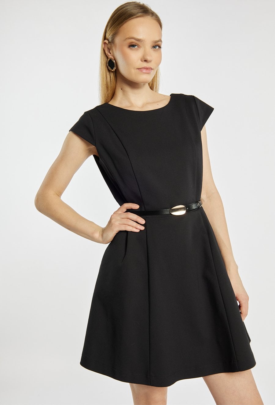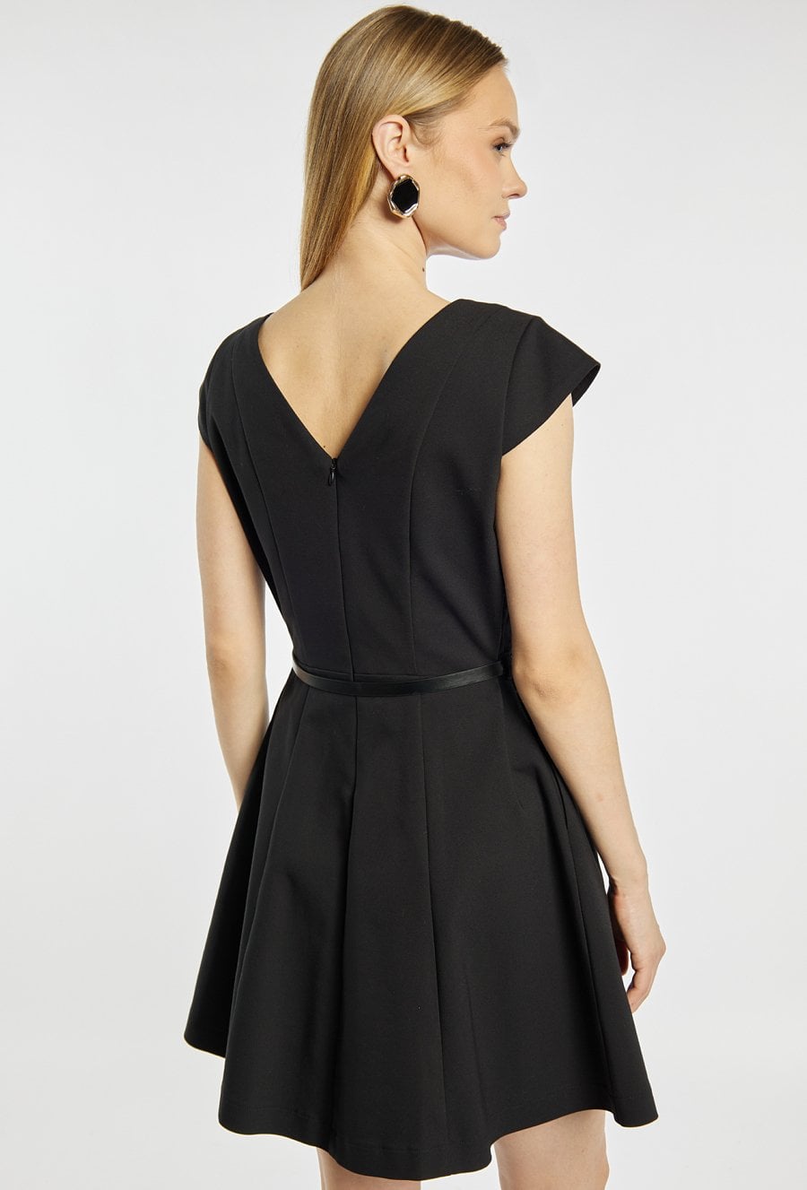 Sukienka mini o eleganckim, rozkloszowanym fasonie. Model z okrągłym dekoltem z przodu oraz dekoltem w kształcie litery V na plecach, który dodaje całości subtelnej zmysłowości. Krótkie, lekko podwinięte rękawy oraz pasek w talii pięknie podkreślają sylwetkę. Sukienka doskonale sprawdzi się na eleganckie wyjścia, przyjęcia oraz uroczystości. Modelka na zdjęciu ma 177 cm wzrostu i prezentuje rozmiar 36.