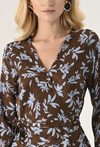 Długa sukienka o eleganckim, a zarazem swobodnym kroju. Kopertowy dekolt wysmukla szyję, a długie rękawy dodają klasy. Wzór w kwiaty nadaje całości romantycznego charakteru. Sukienka posiada praktyczne kieszenie po bokach, które łączą styl z wygodą. Idealna na rodzinne uroczystości, przyjęcia lub codzienne wyjścia jesienią. Modelka na zdjęciu ma 174 cm wzrostu i nosi rozmiar 36.