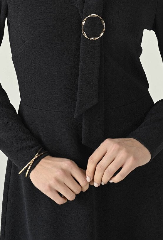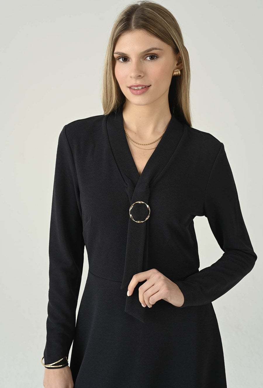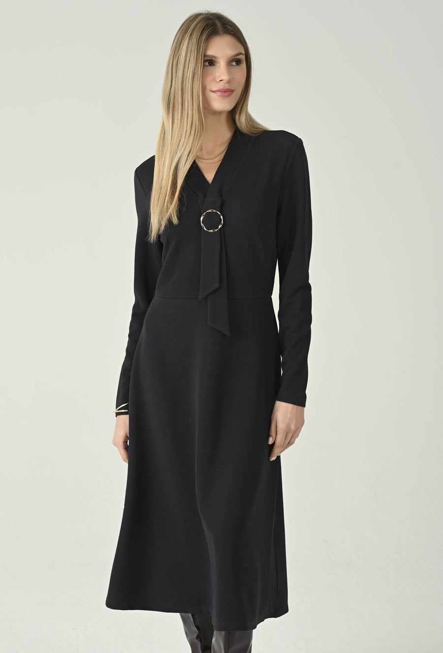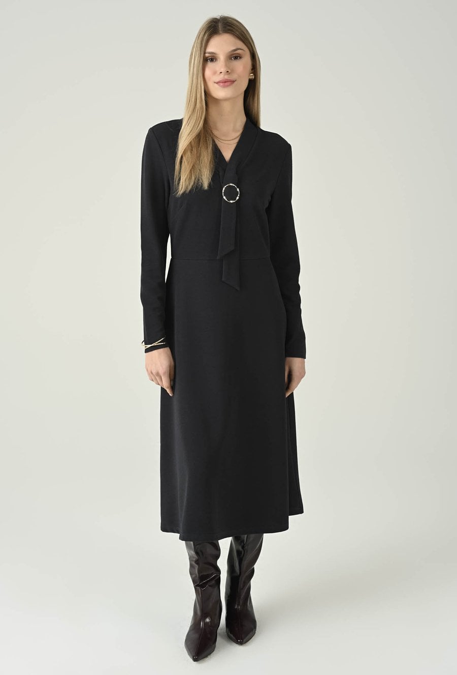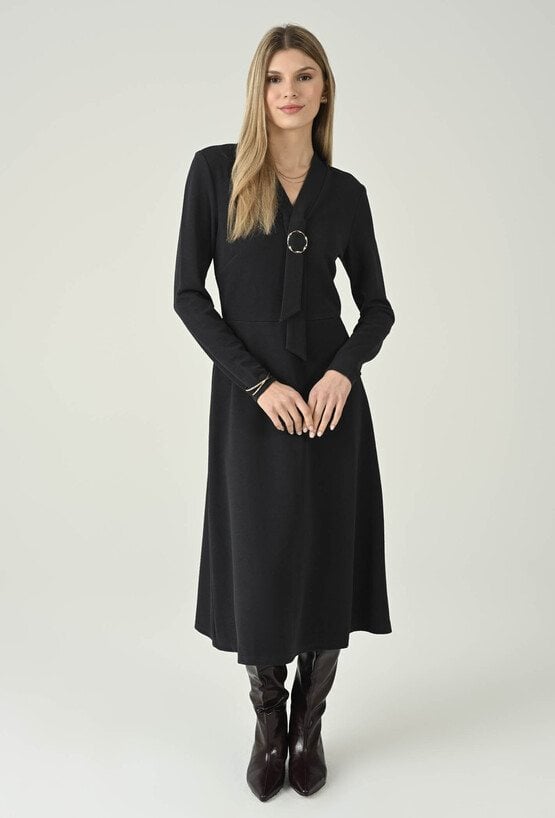 Stylowa dzianinowa sukienka o długości midi, która łączy komfort z kobiecą elegancją. Miękka, elastyczna dzianina pięknie dopasowuje się do sylwetki, a długi rękaw sprawia, że model idealnie sprawdzi się także w chłodniejsze dni. Dekolt w kształcie litery V z ozdobną klamrą przyciąga uwagę i nadaje całości wyjątkowego charakteru. To uniwersalna propozycja, która doskonale wygląda zarówno z botkami, jak i eleganckimi dodatkami. Modelka na zdjęciu ma 177 cm wzrostu i prezentuje rozmiar 36.