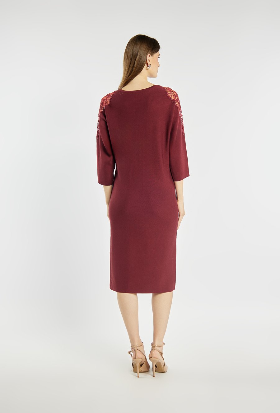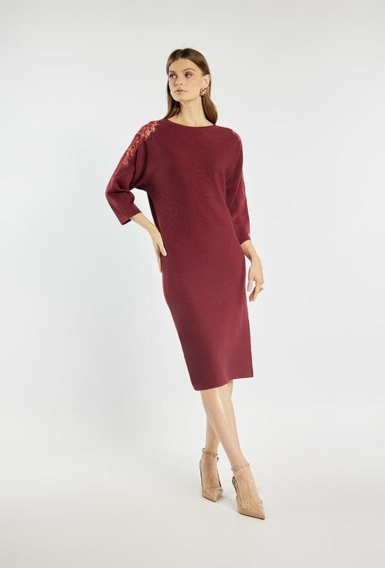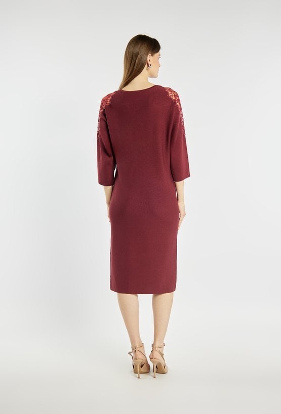 Elegancka sukienka damska o klasycznym kroju. Model z rękawem 3/4 i delikatnie zwężanym fasonem, który pięknie podkreśla sylwetkę. Sukienka z ozdobnymi aplikacjami na ramionach. Idealna propozycja na świąteczne spotkania, rodzinne uroczystości lub wieczorne przyjęcia. Modelka na zdjęciu ma 177 cm wzrostu i prezentuje rozmiar 36.
