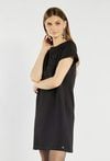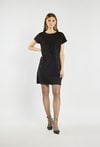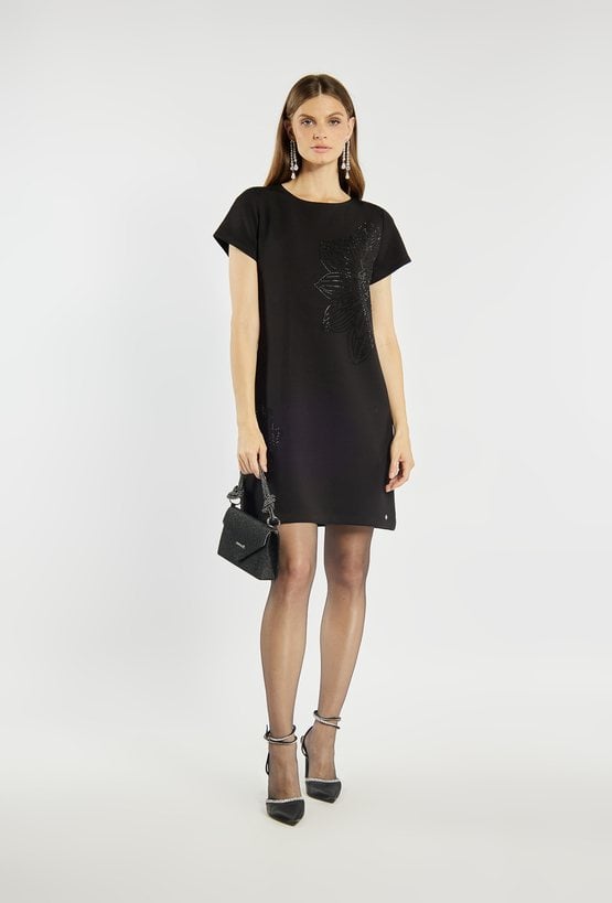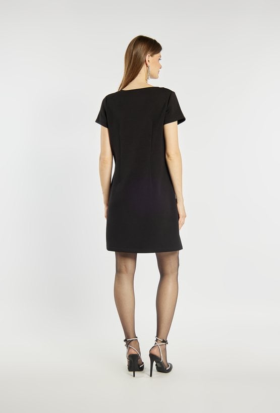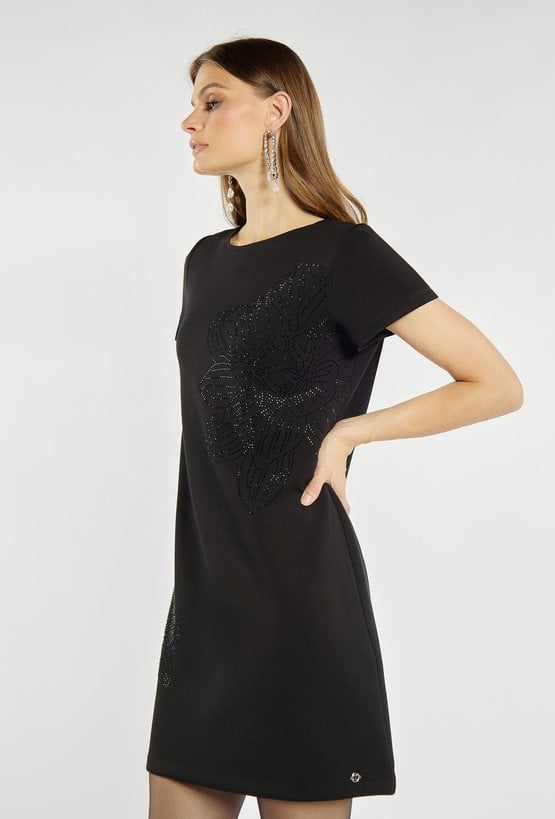 Elegancka sukienka o prostym, klasycznym kroju z krótkim rękawem. Przód zdobi duży kwiatowy motyw wykonany z błyszczących aplikacji, który dodaje całości szyku i subtelnego blasku. Idealna propozycja na święta, sylwestra czy uroczyste kolacje. Modelka na zdjęciu ma 177 cm wzrostu i prezentuje rozmiar 36.