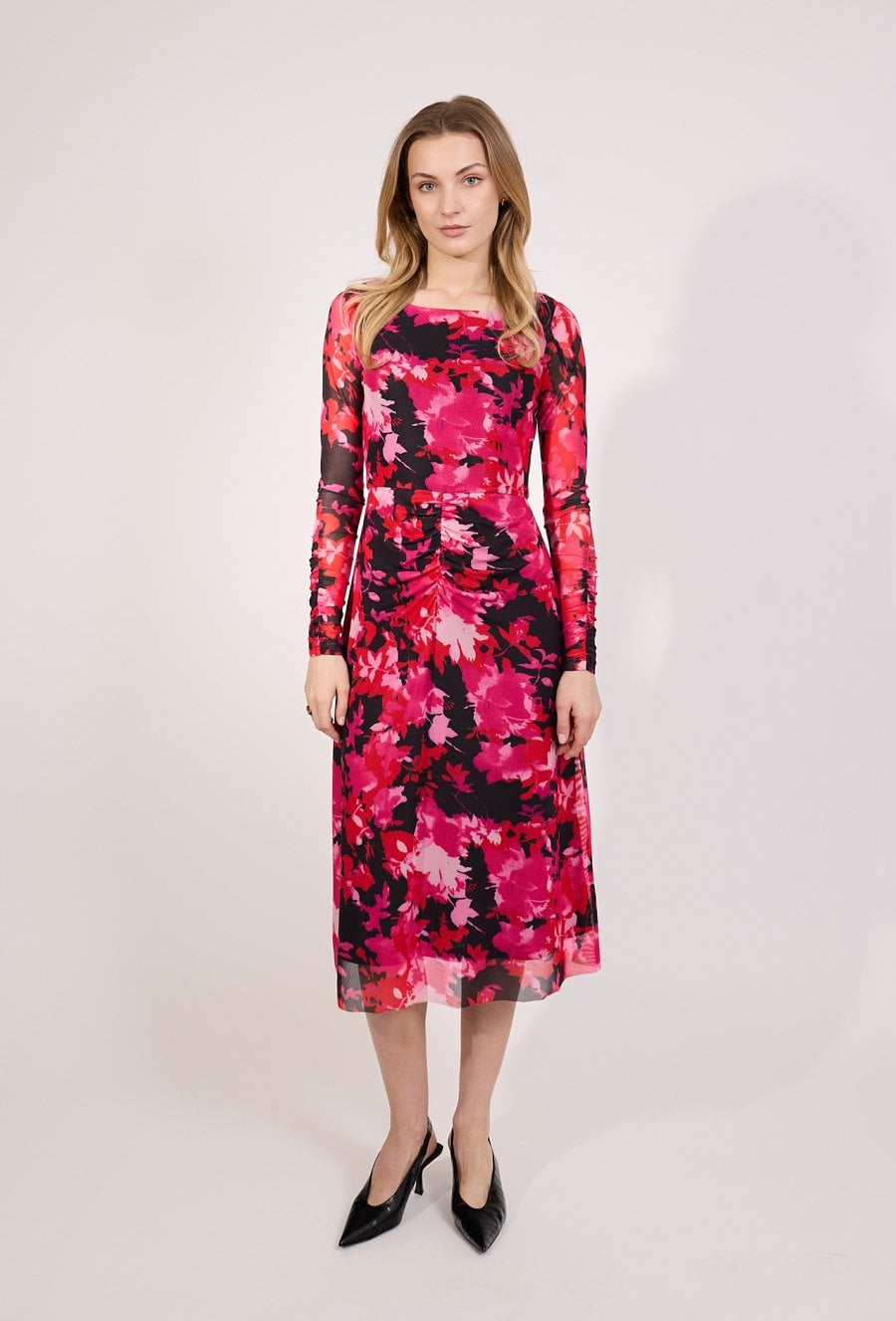 Elegancka sukienka damska o długości midi z długim rękawem. Model z dopasowanym krojem oraz efektownym, kwiatowym wzorem, który przyciąga uwagę. Sukienka doskonale sprawdzi się na przyjęcia, spotkania oraz inne uroczystości. Modelka na zdjęciu ma 177 cm wzrostu i prezentuje rozmiar 36.