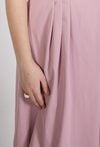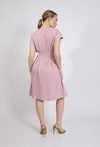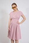 Sukienka damska o eleganckim, kobiecym kroju. Model o długości midi z krótkim, lekko opadającym rękawem oraz klasycznym, zaokrąglonym dekoltem. W talii zastosowano efektowne przeszycia i zakładki, które podkreślają sylwetkę oraz nadają sukience wyjątkowego charakteru. Rozkloszowany dół pięknie układa się w ruchu, zapewniając komfort noszenia. Modelka na zdjęciu ma 177 cm wzrostu i prezentuje rozmiar S.