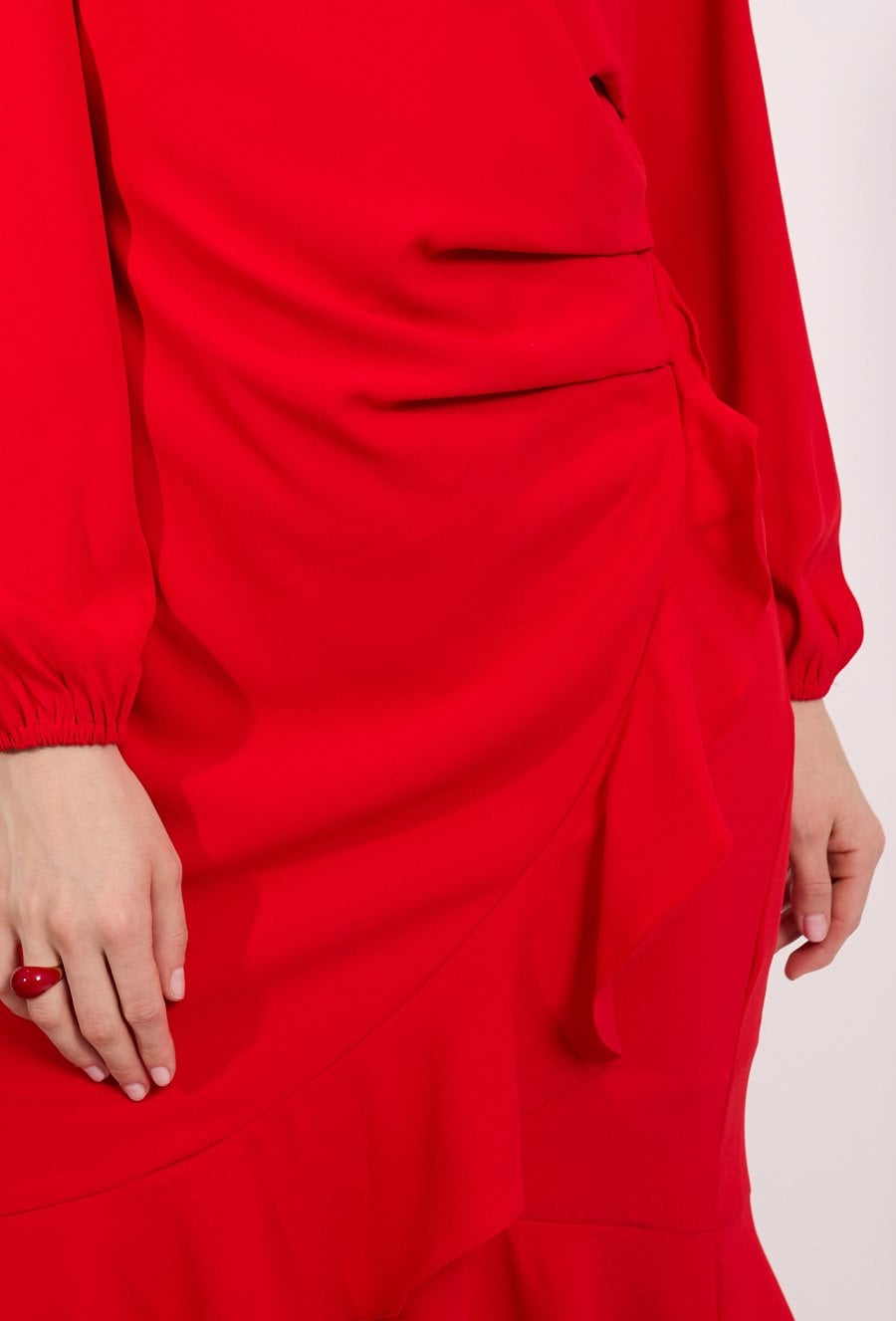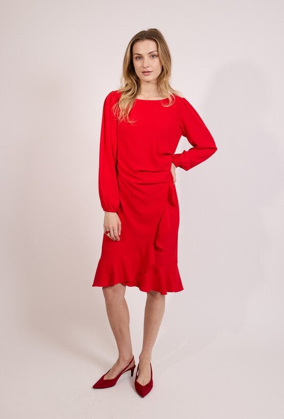 Elegancka sukienka damska o długości midi z długim rękawem. Model z prostym dekoltem oraz efektownym wiązaniem i falbaną u dołu, które nadają stylizacji lekkości i kobiecego charakteru. Sukienka doskonale sprawdzi się na przyjęcia, spotkania oraz inne uroczystości. Modelka na zdjęciu ma 177 cm wzrostu i prezentuje rozmiar 36.