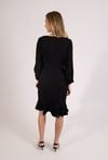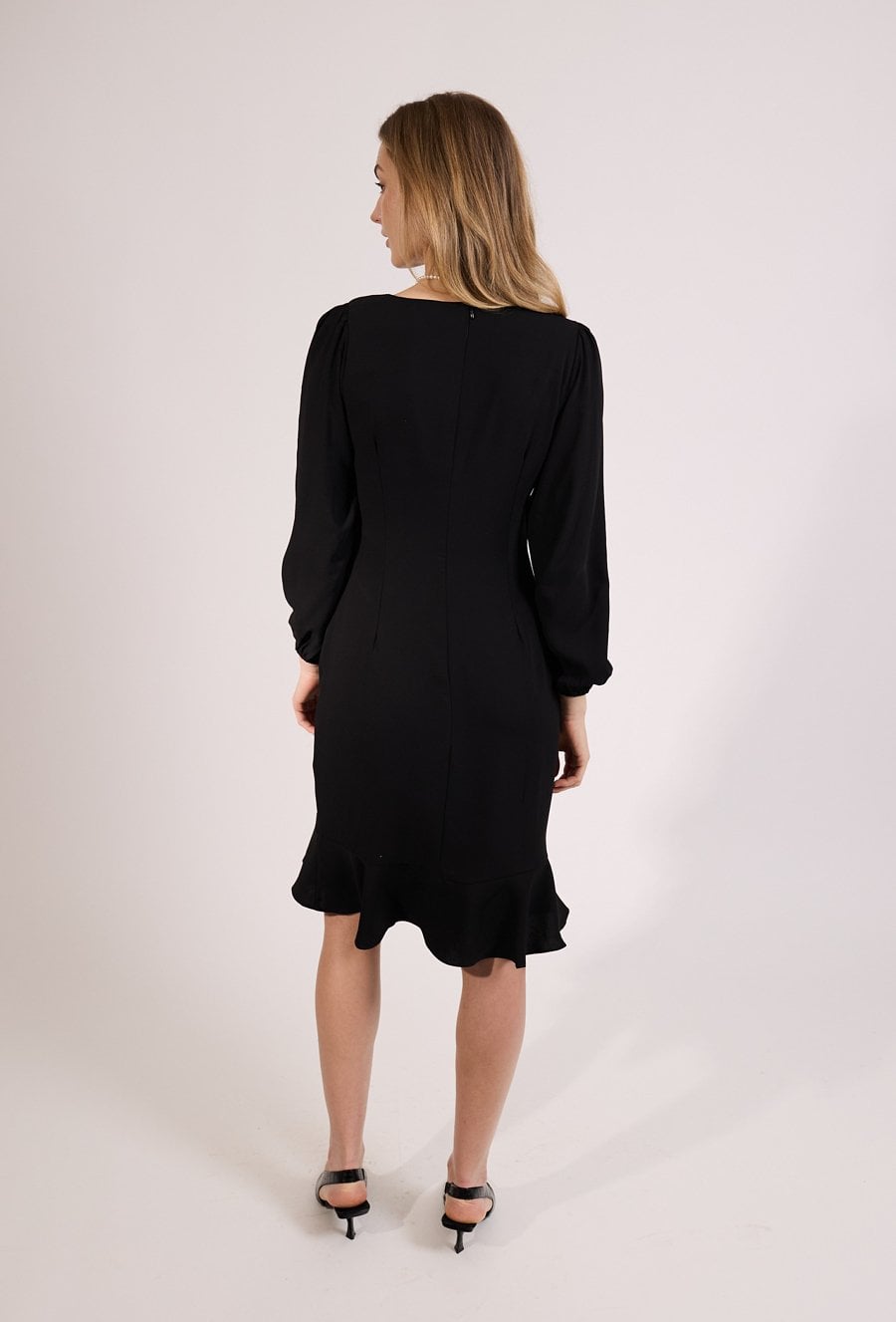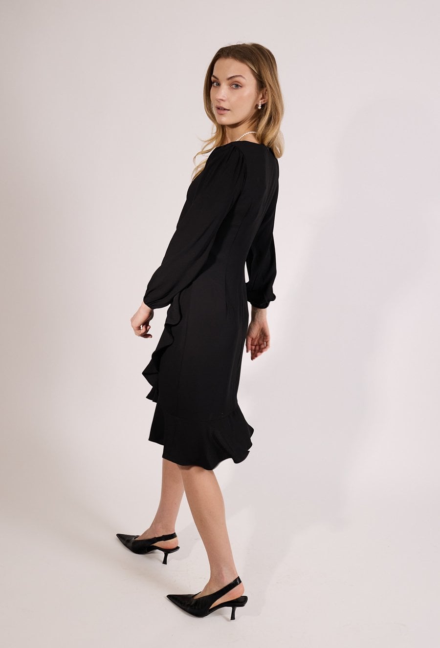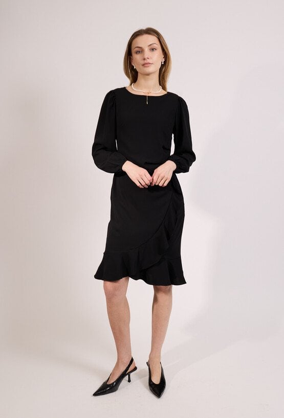 Elegancka sukienka damska o długości midi z długim rękawem. Model z prostym dekoltem oraz efektownym wiązaniem i falbaną u dołu, które nadają stylizacji lekkości i kobiecego charakteru. Sukienka doskonale sprawdzi się na przyjęcia, spotkania oraz inne uroczystości. Modelka na zdjęciu ma 177 cm wzrostu i prezentuje rozmiar 36.
