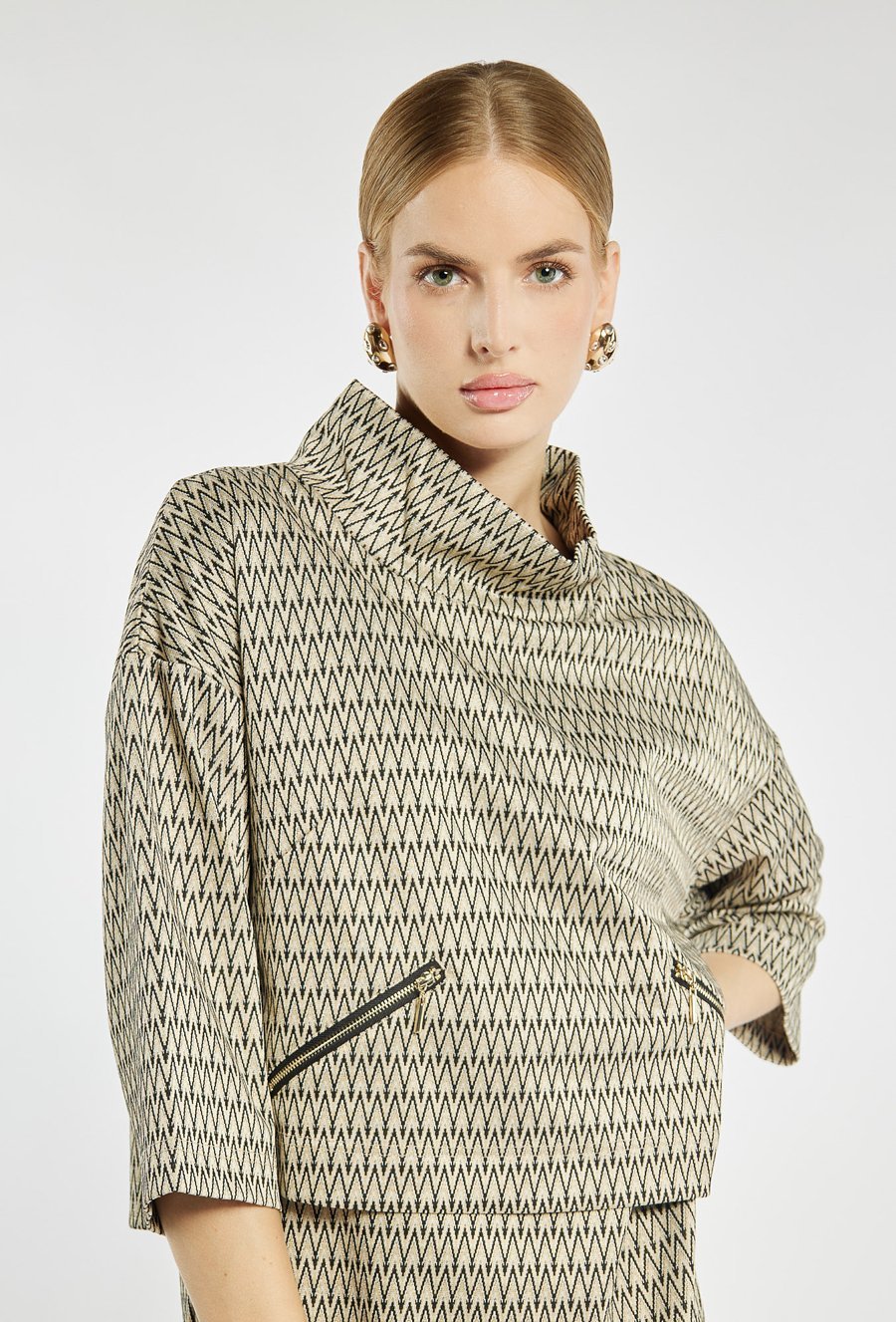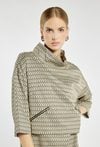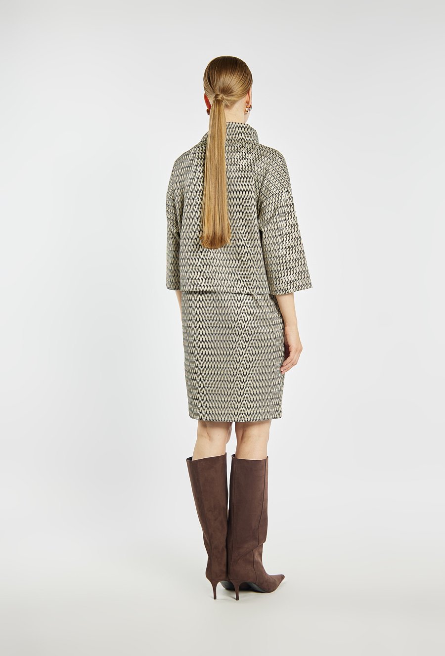 Elegancka sukienka o prostym kroju o subtelnym, geometrycznym wzorze. Sukienka wyposażona w półgolf oraz rękawy o długości 3/4, z ozdobnymi kieszonkami na przodzie. Długość do kolan sprawia, że doskonale sprawdzi się zarówno na co dzień, jak i na bardziej formalne okazje. Modelka na zdjęciu ma 177 cm wzrostu i prezentuje rozmiar 36.
