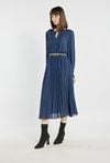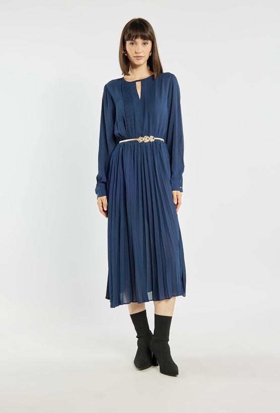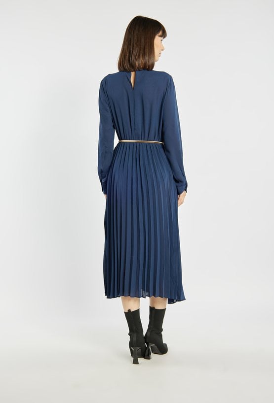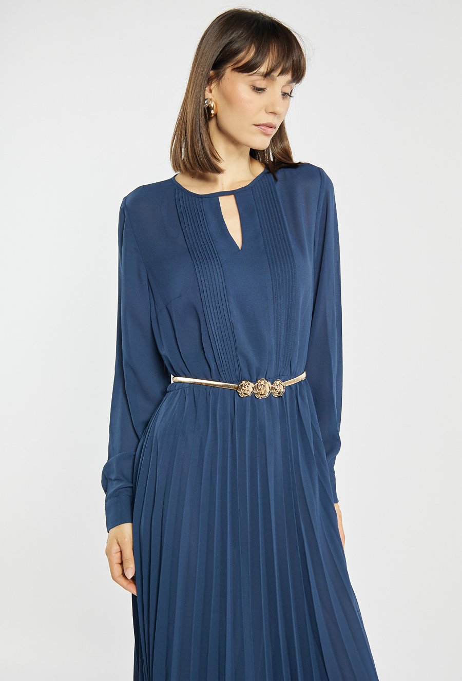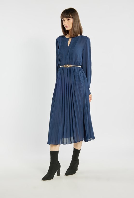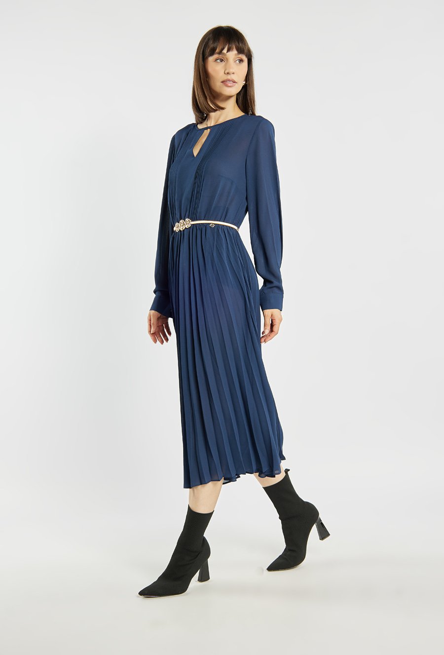 Sukienka midi o eleganckim kroju, z długim rękawem i subtelnym dekoltem w kształcie łezki. Góra ozdobiona delikatnymi pionowymi przeszyciami, które optycznie wysmuklają sylwetkę. Dolna część plisowana, co nadaje lekkości i kobiecego charakteru. Idealna propozycja na wyjątkowe okazje, sprawdzi się zarówno w stylizacjach wieczorowych, jak i eleganckich zestawach dziennych. Modelka na zdjęciu ma 177 cm wzrostu i prezentuje rozmiar 36.