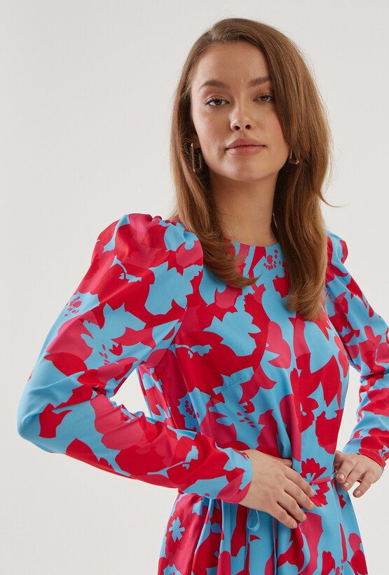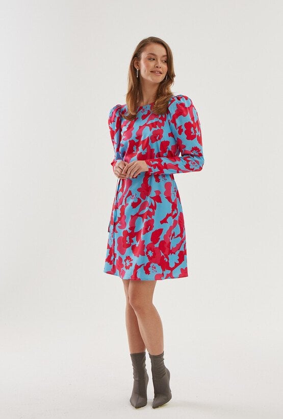 Sukienka w pięknym turkusowo-różowym kolorze, długie rękawy z delikatną bufką okrągły dekolt. Charakteru dodają jej motyw kwiatowy. Sukienka ma fason w kształcie litery A oraz pasek w tali którym można pięknie podkreślić sylwetkę. W tej sukience nie przejdziesz niezauważona! Modelka na zdjęciu ma 174 cm wzrostu i prezentuje rozmiar 36.
