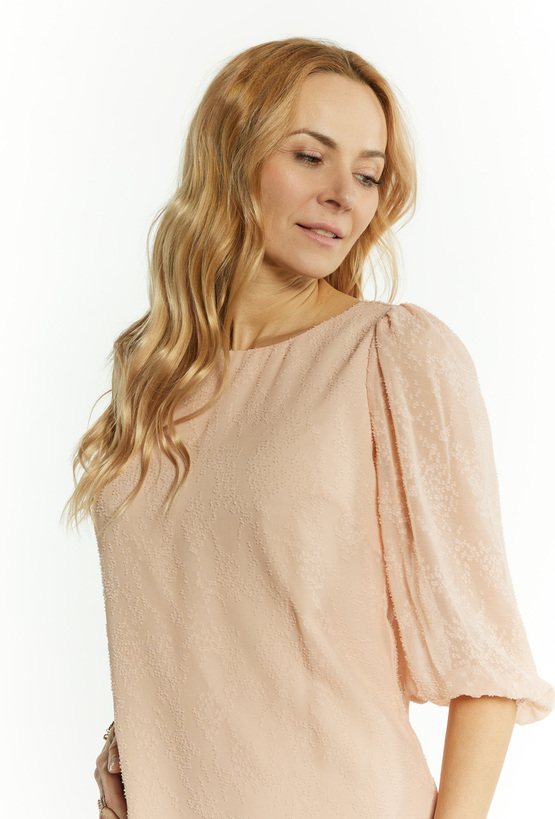 Elegancka sukienka damska o prostym kroju. Sukienka z półokrągłym dekoltem oraz dłuższymi, prześwitującymi rękawami. Sukienka zapinana na guzik z tyłu. Model ten z pewnością sprawdzi się w wyjątkowych okazjach. Modelka na zdjęciu ma 177 cm wzrostu i prezentuje rozmiar 36.