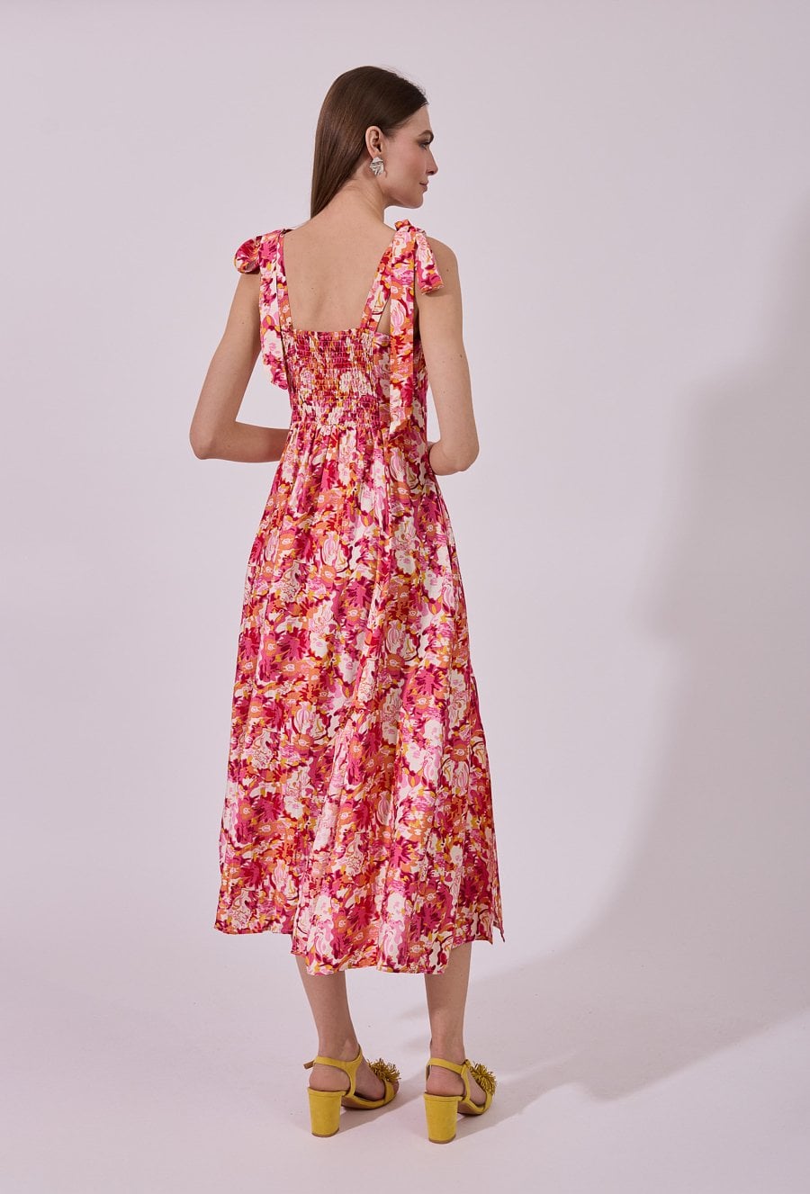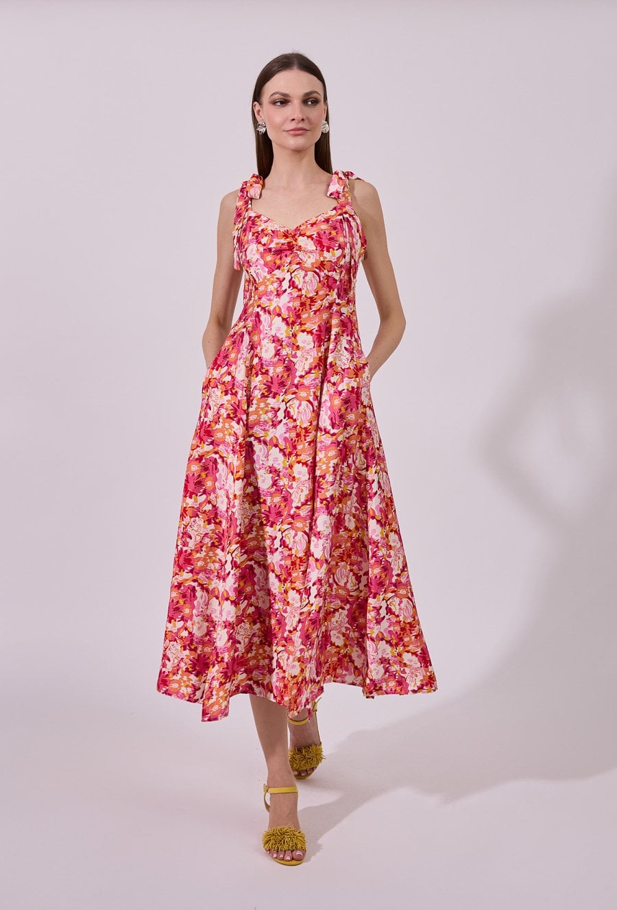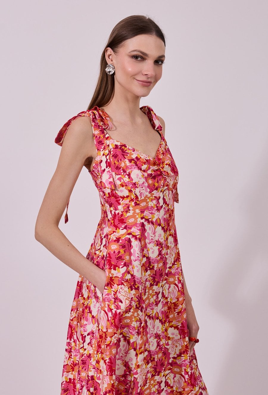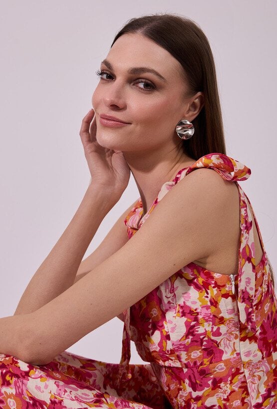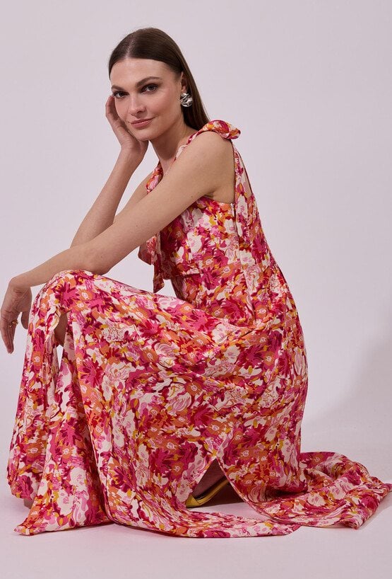 Sukienka damska midi na ramiączkach. Model z dekoltem w kształcie serca oraz wiązanymi ramiączkami, które nadają całości kobiecego i romantycznego charakteru. W talii delikatnie dopasowana, podkreśla sylwetkę, a rozcięcie na nodze dodaje lekkości i subtelnej zmysłowości. Idealna na letnie wyjścia i wyjątkowe okazje. Modelka na zdjęciu ma 177 cm wzrostu i prezentuje rozmiar 36.