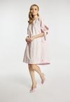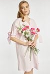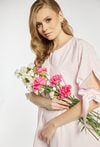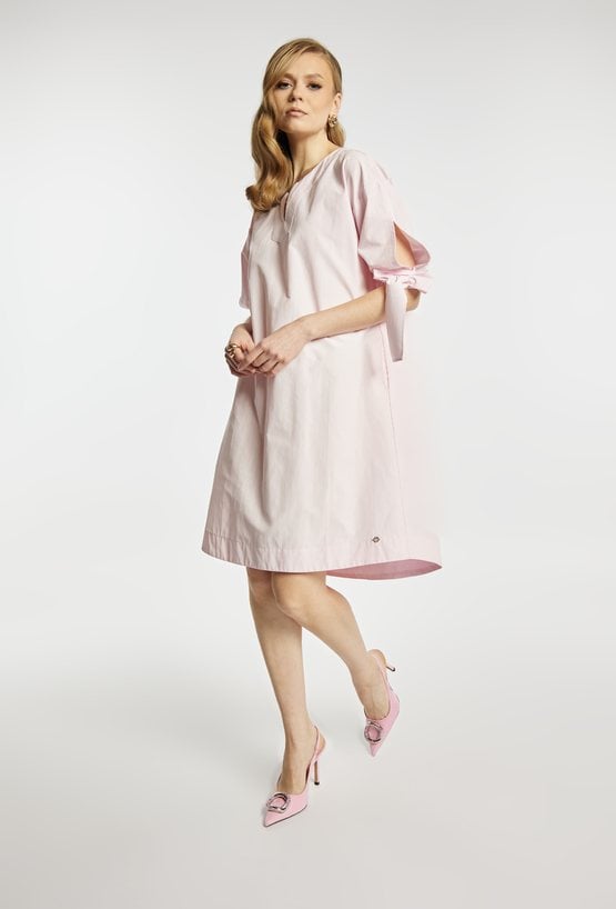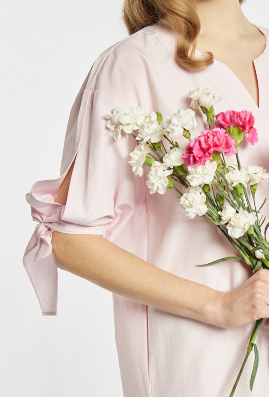 Sukienka damska o luźnym, komfortowym kroju, wykonana z lekkiego i przyjemnego w dotyku materiału. Sukienka z krótkimi rękawami wykończonymi dekoracyjnymi wiązaniami oraz delikatnym, półokrągłym dekoltem tworzy subtelną, kobiecą sylwetkę. Model w pastelowym odcieniu świetnie sprawdzi się zarówno na co dzień, jak i na specjalne okazje. Modelka na zdjęciu ma 177 cm wzrostu i prezentuje rozmiar S/M.