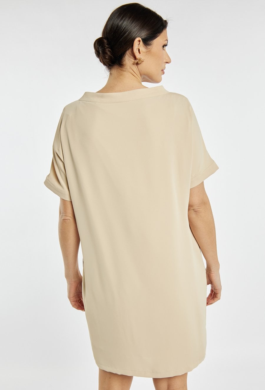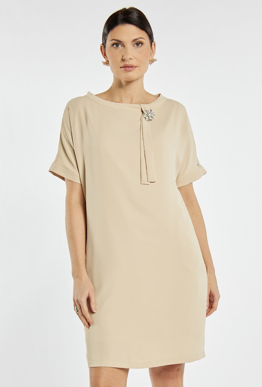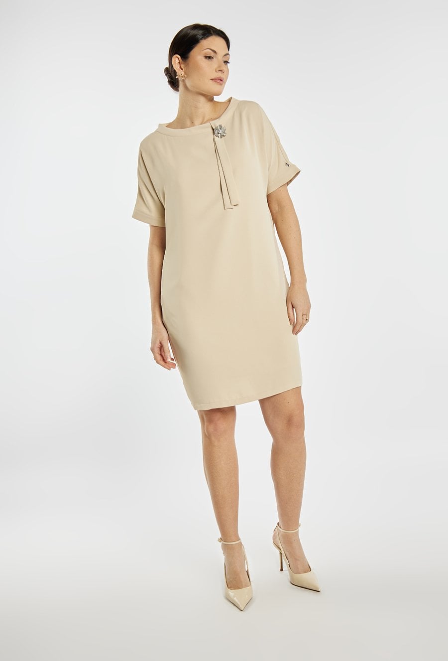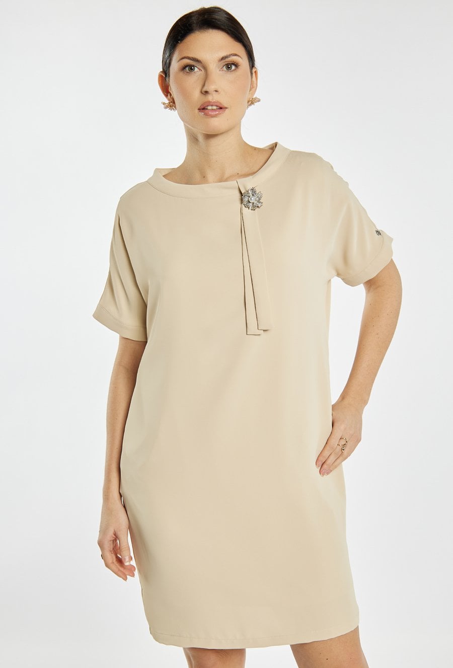 Elegancka sukienka damska midi z krótkim rękawem o prostym kroju. Model wyróżnia się ozdobną broszką oraz subtelnym detalem przy dekolcie, które nadają stylizacji eleganckiego charakteru. Sukienka doskonale sprawdzi się na komunię, rodzinne przyjęcia, spotkania oraz inne uroczystości. Modelka na zdjęciu ma 177 cm wzrostu i prezentuje rozmiar 36.