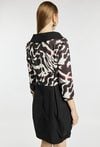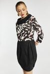 Sukienka z długim rękawem wyróżnia się połączeniem wzorzystej góry z jednolitym, balonowym dołem, co nadaje jej nowoczesnego i niebanalnego charakteru. Szeroki kołnierz podkreśla stylowy fason. Model idealny na specjalne okazje oraz wieczorne wyjścia. Modelka na zdjęciu ma 177 cm wzrostu i prezentuje rozmiar 36.