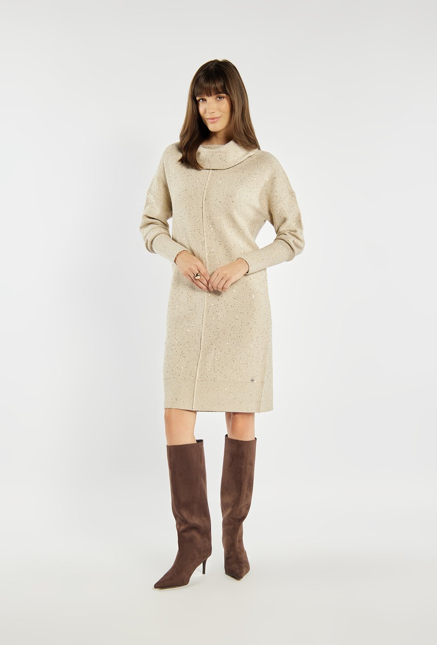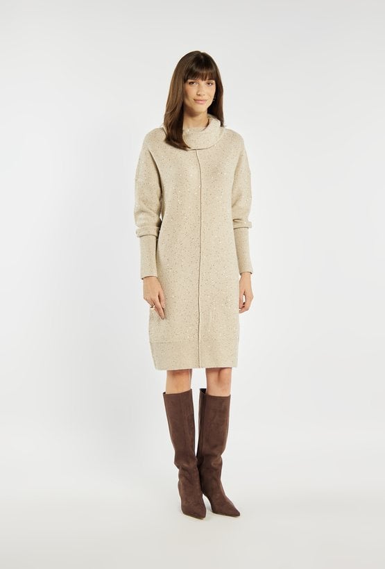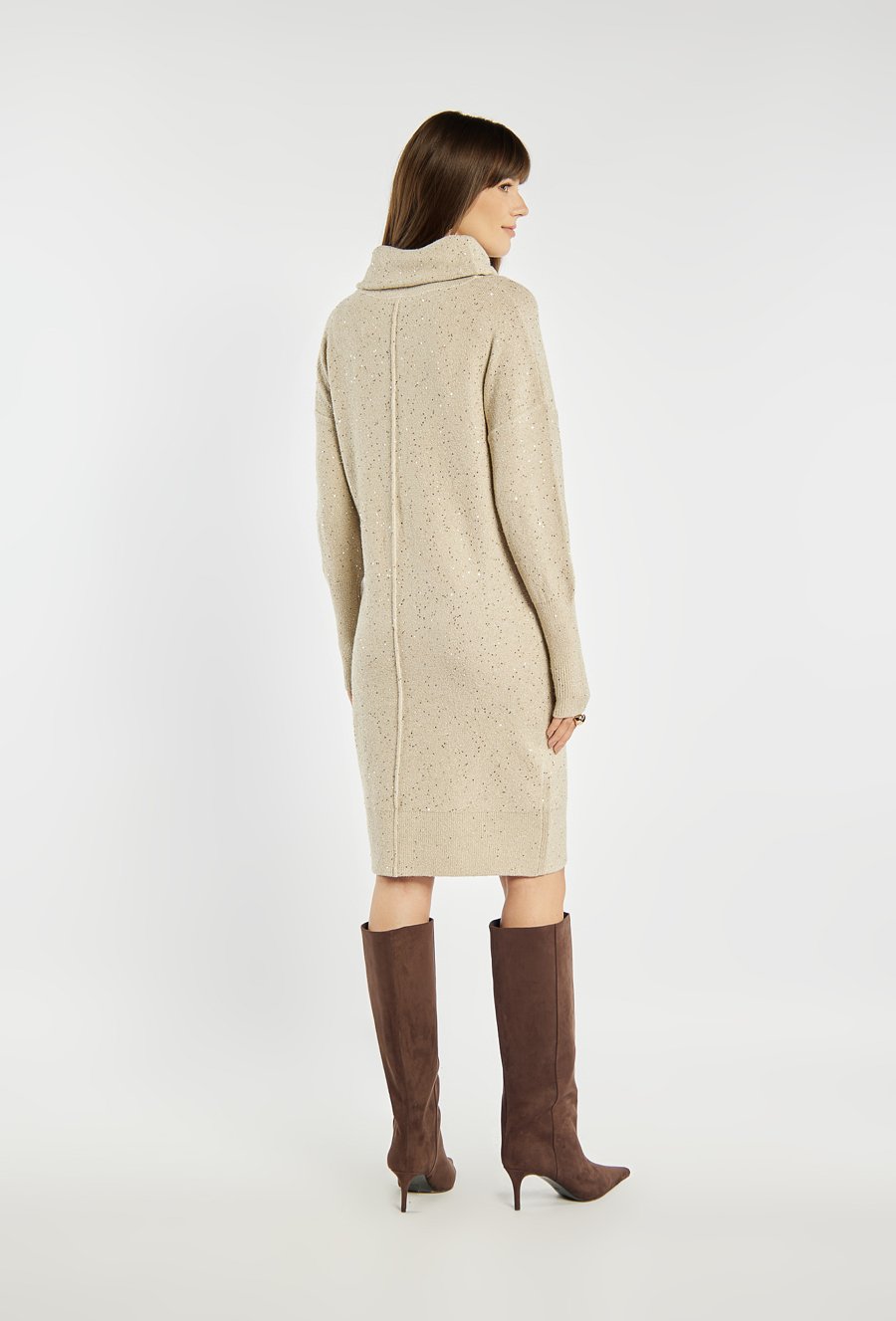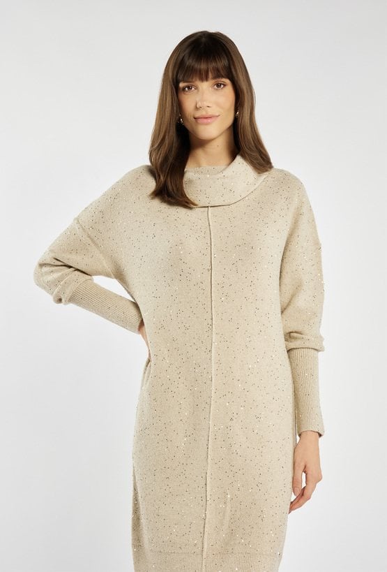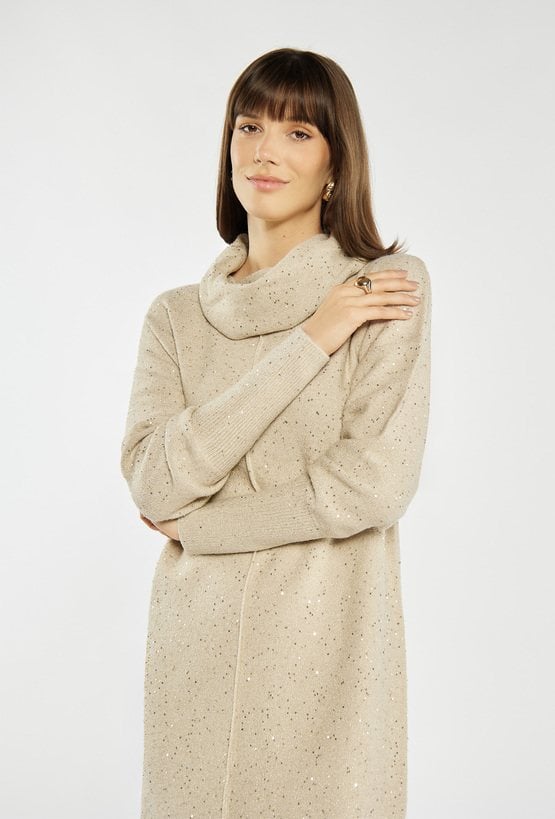 Sukienka damska o prostym kroju, z długim rękawem i szerokim kołnierzem typu golf. W materiał wplecione są delikatne, drobne cekiny, które subtelnie odbijają światło i nadają całości eleganckiego, świątecznego charakteru. Idealna propozycja na święta i zimowe spotkania. Modelka na zdjęciu ma 177 cm wzrostu i prezentuje rozmiar 36.