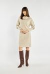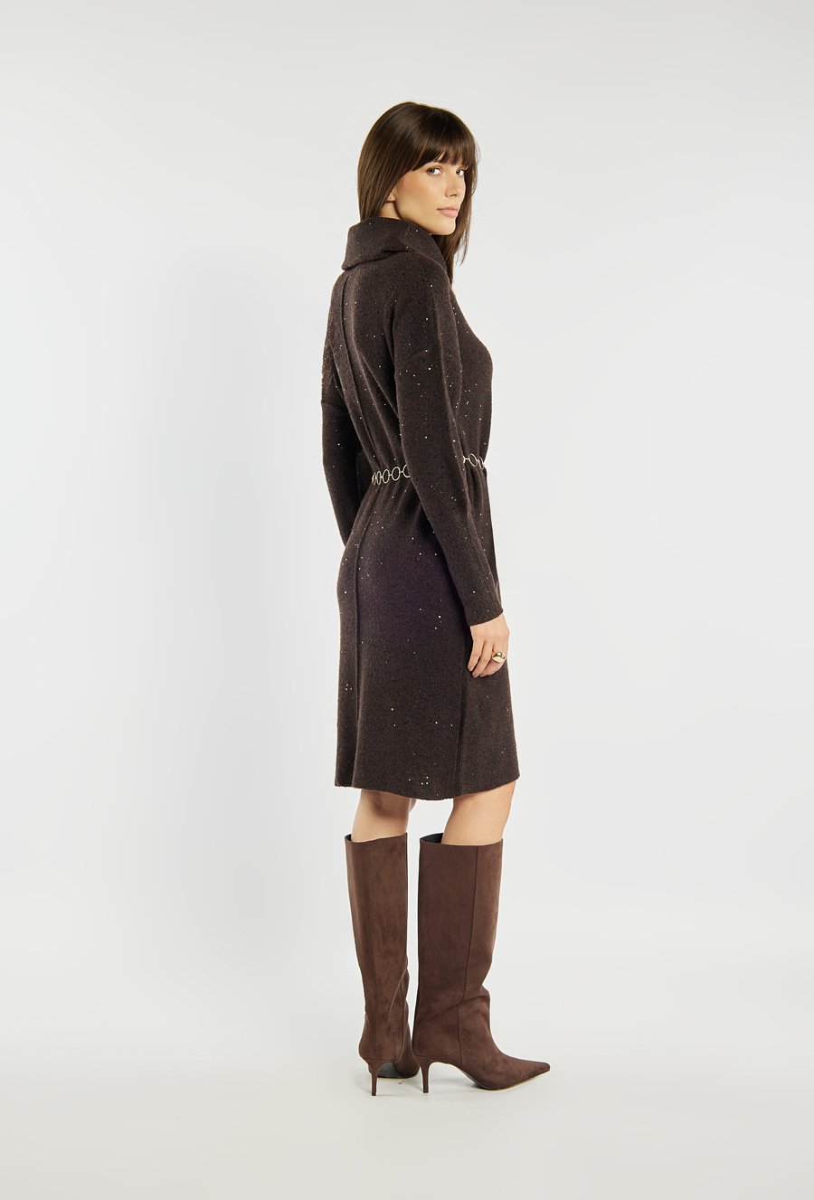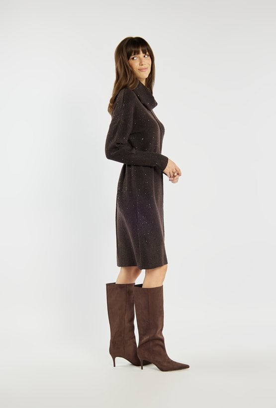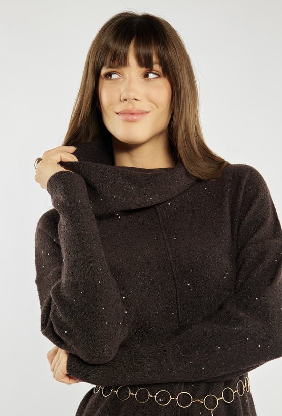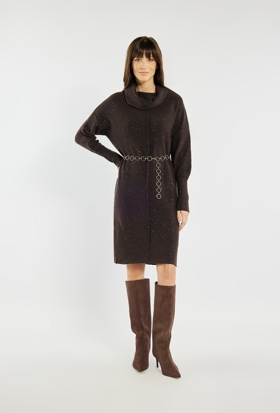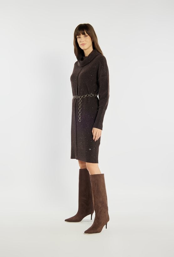 Sukienka damska o prostym kroju, z długim rękawem i szerokim kołnierzem typu golf. W materiał wplecione są delikatne, drobne cekiny, które subtelnie odbijają światło i nadają całości eleganckiego, świątecznego charakteru. Idealna propozycja na święta i zimowe spotkania. Pasek widoczny na zdjęciu nie jest elementem sukienki. Modelka na zdjęciu ma 177 cm wzrostu i prezentuje rozmiar 36.