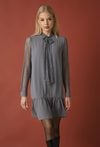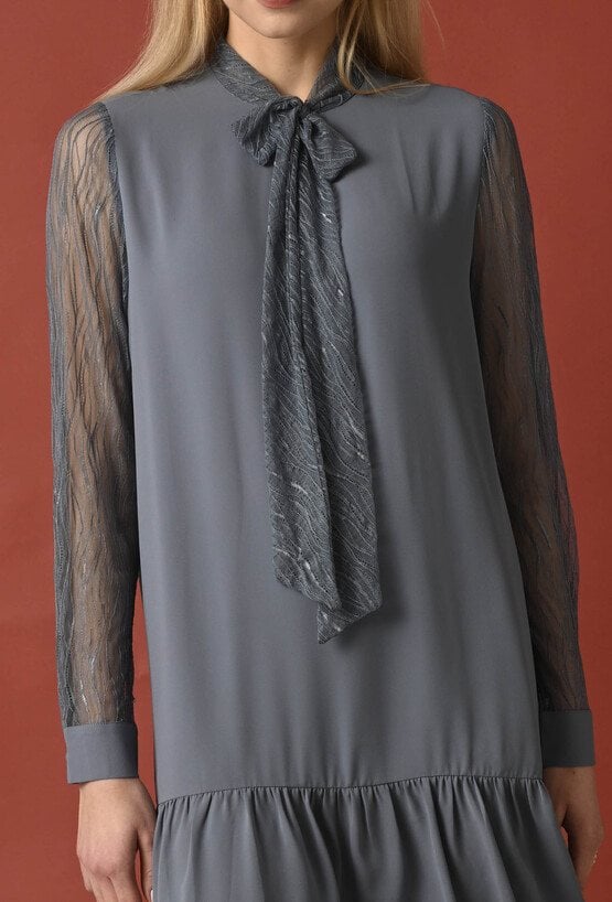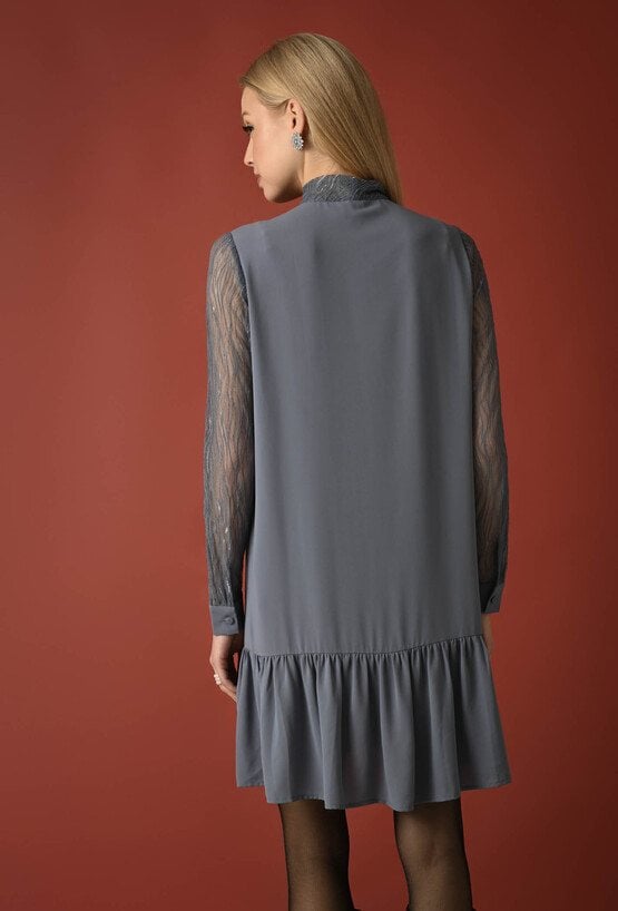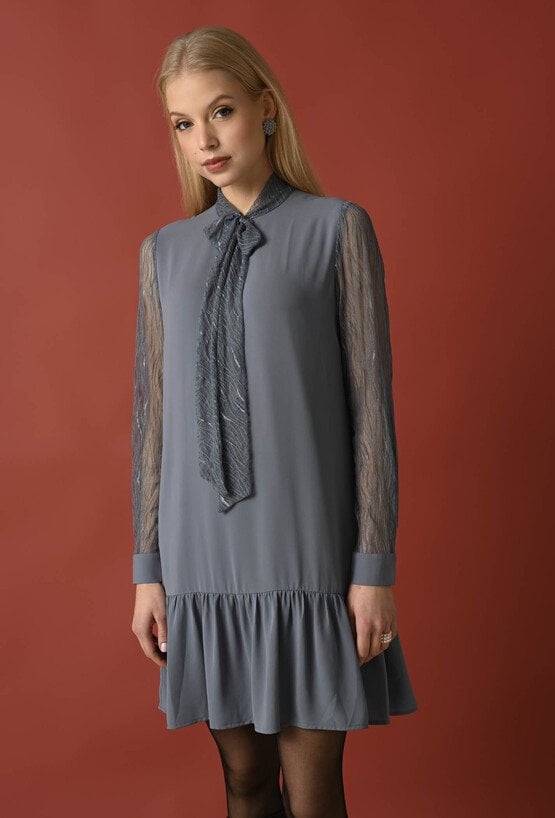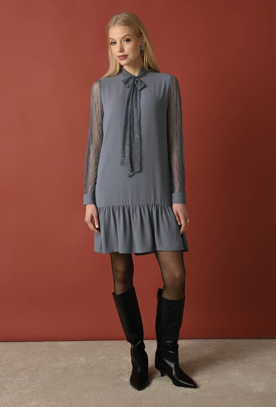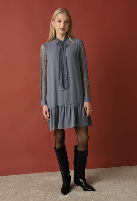 Elegancka sukienka w pięknym kolorze retro blue zakończona falbaną, uszyta z gładkiej tkaniny. Uroku dodają jej koronkowe rękawy i szarfa przy dekolcie Uniwersalny krój doskonale dopasowuje się do każdej sylwetki To idealny wybór nie tylko na wieczorne wyjścia, ale również na inne wyjątkowe okazje. Modelka na zdjęciu ma 177 cm wzrostu i nosi rozmiar 36.