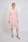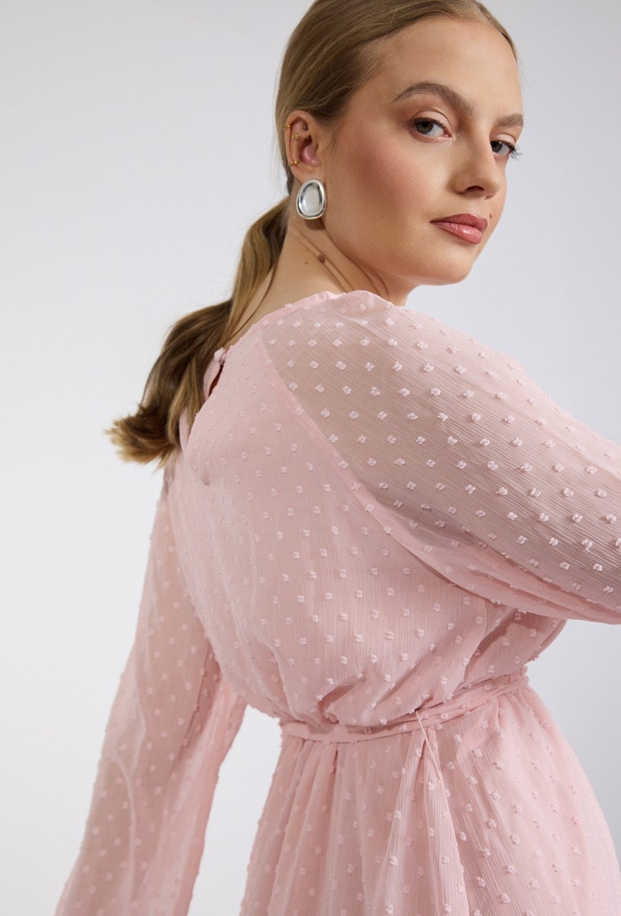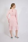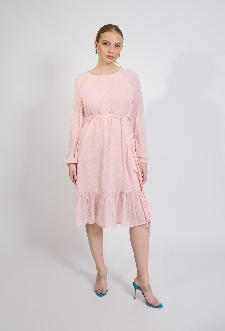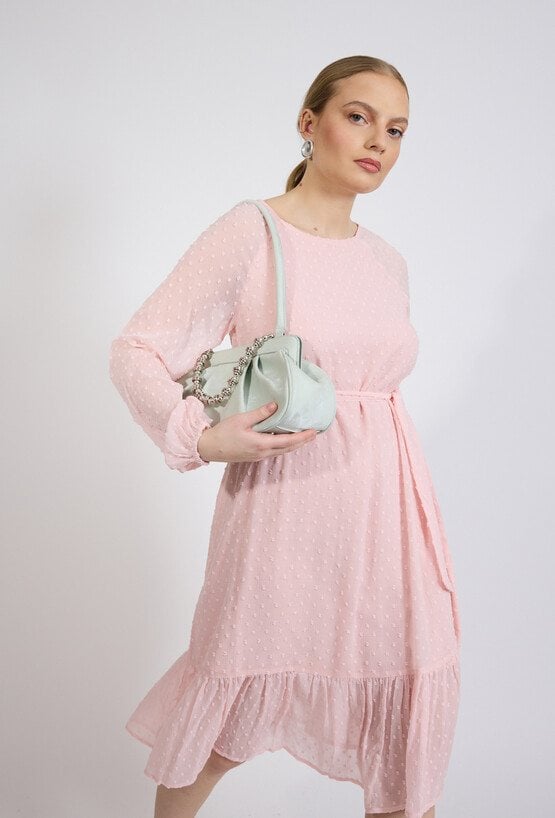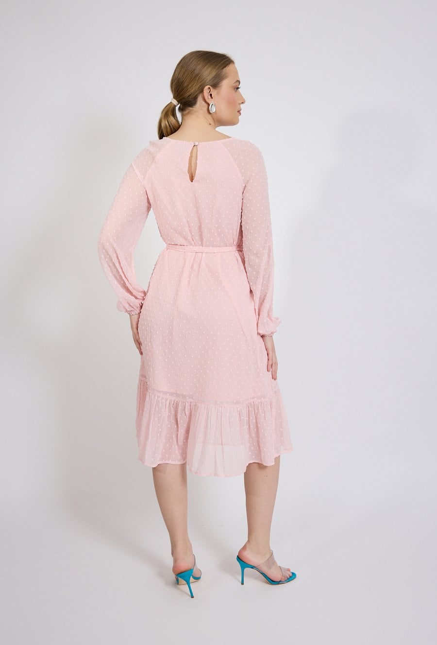 Sukienka damska o lekkim, kobiecym kroju. Model o długości midi z długim rękawem zakończonym elastycznym mankietem oraz klasycznym, półokrągłym dekoltem. Talia podkreślona wiązaniem, które pozwala na dopasowanie sukienki do sylwetki. Sukienka idealnie sprawdzi się na wyjątkowe okazje, w połączeniu ze szpilkami lub balerinami. Modelka na zdjęciu ma 177 cm wzrostu i prezentuje rozmiar 36.