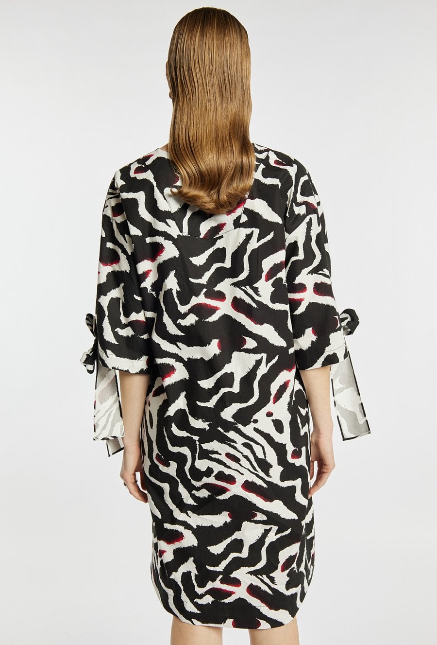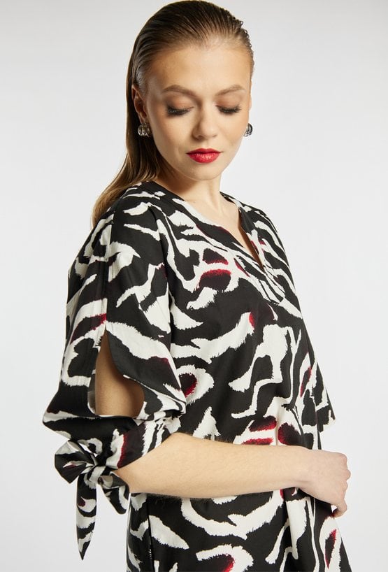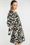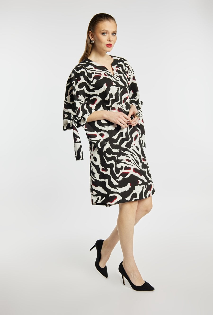 Sukienka damska z wyrazistym, abstrakcyjnym wzorem. Model z dekoltem w kształcie litery V oraz rękawami 3/4, ozdobionymi wiązaniami przy mankietach. Długość do kolan zapewnia komfort i uniwersalność. Sukienka doskonale sprawdzi się w codziennych stylizacjach, jak i na bardziej eleganckie wyjścia. Modelka na zdjęciu ma 177 cm wzrostu i prezentuje rozmiar S/M.