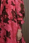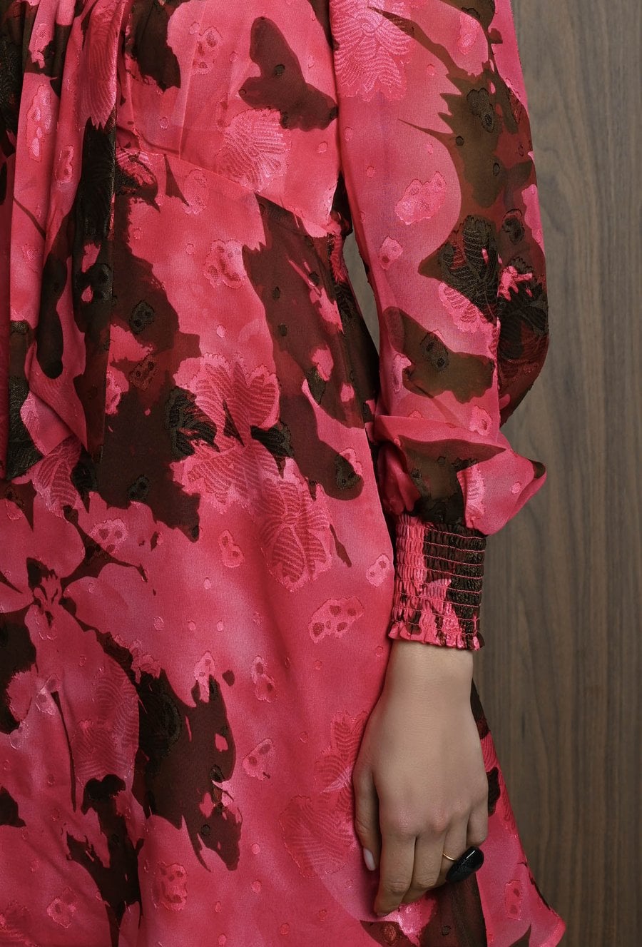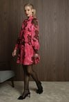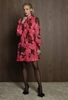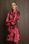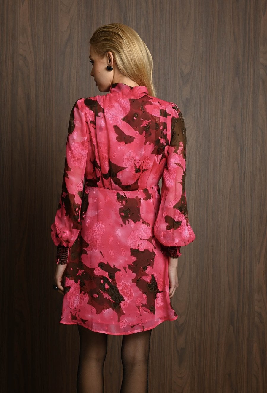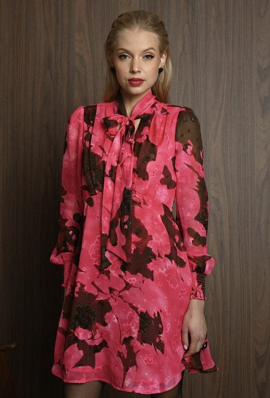 Niezwykle kobieca sukienka w piękny print, wykonana ze zwiewnej tkaniny. Posiada szarfę przy dekolcie, która dodaje jej klasy i elegancji. Długie rękawy zakończone są szerokimi mankietami, nadając im delikatnej bufki. Sukienka posiada podszewkę. To model z efektem „wow”, który doskonale sprawdzi się podczas wieczorowych wyjść oraz świątecznych uroczystości rodzinnych. Modelka ma 177 cm wzrostu i prezentuje rozmiar 36.