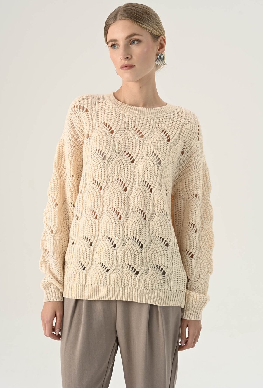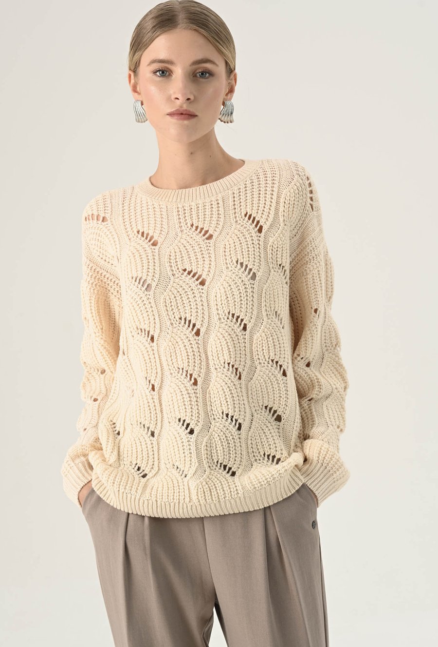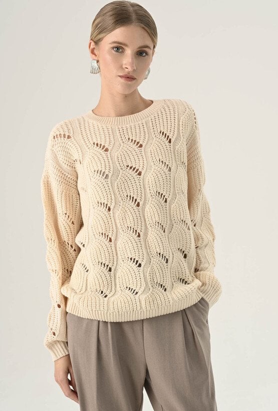 Sweter o prostym kroju wykonany z delikatnej, ażurowej dzianiny, to doskonały sposób na optyczne rozświetlenie Twoich jesiennych stylizacji, kolor śmietanki pięknie prezentuje się w towarzystwie różnych typów urody, a ażurowa dzianina dodaje niezwykłej lekkości. Sweter został wykonany z bawełnianej przędzy. Modelka na zdjęciu ma 177 cm wzrostu i prezentuje rozmiar 36.