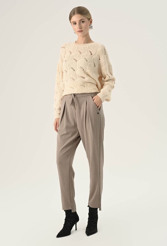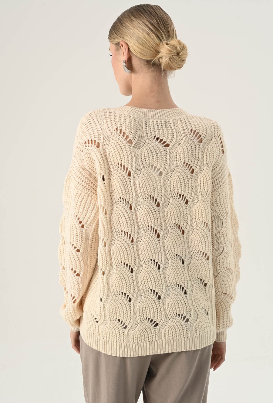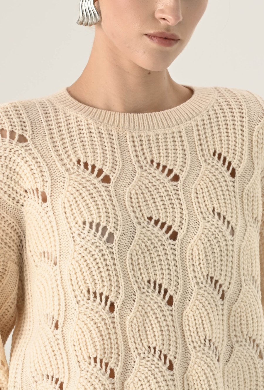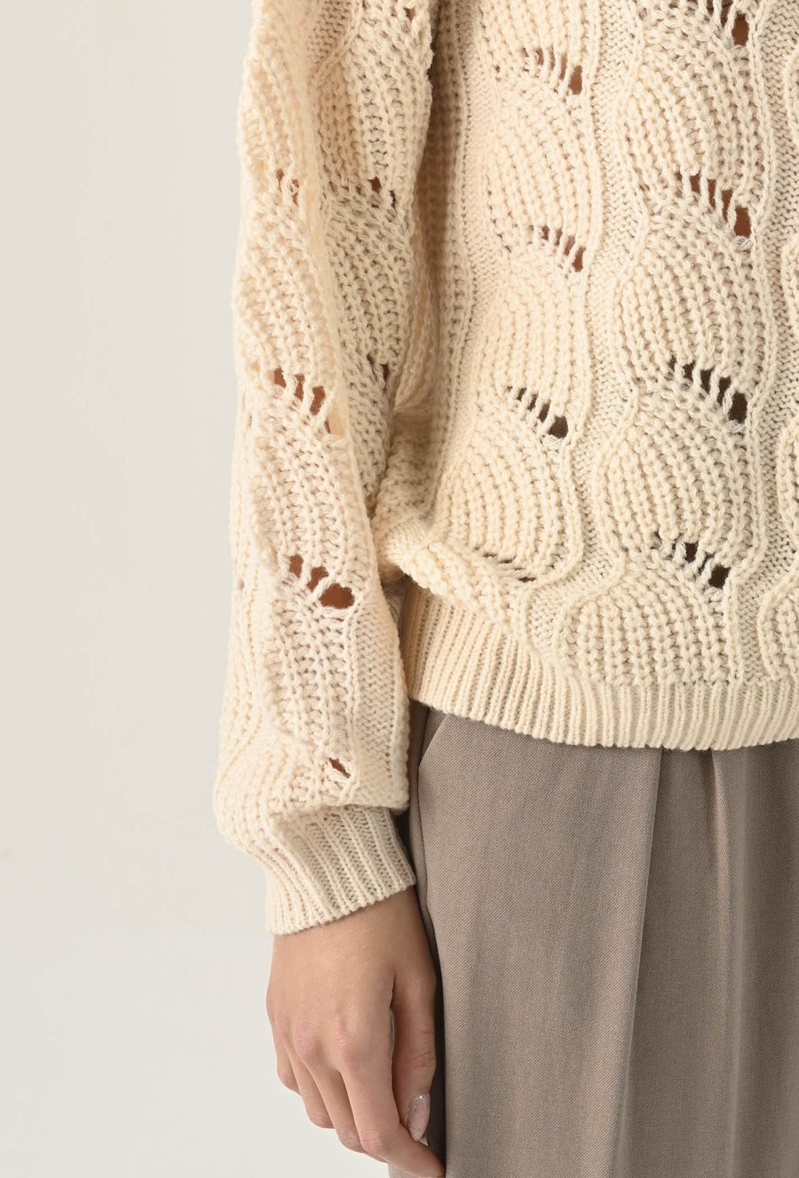 Sweter o prostym kroju wykonany z delikatnej, ażurowej dzianiny, to doskonały sposób na optyczne rozświetlenie Twoich jesiennych stylizacji, kolor śmietanki pięknie prezentuje się w towarzystwie różnych typów urody, a ażurowa dzianina dodaje niezwykłej lekkości. Sweter został wykonany z bawełnianej przędzy. Modelka na zdjęciu ma 177 cm wzrostu i prezentuje rozmiar 36.
