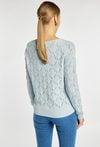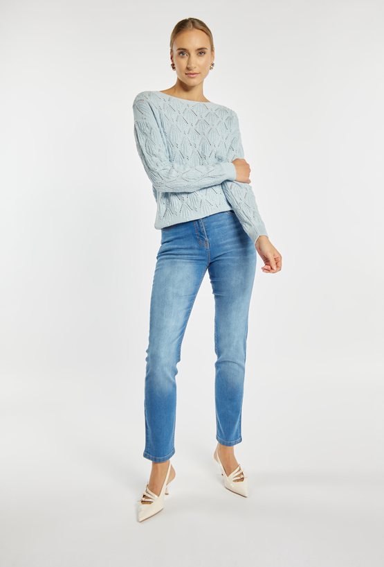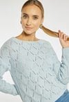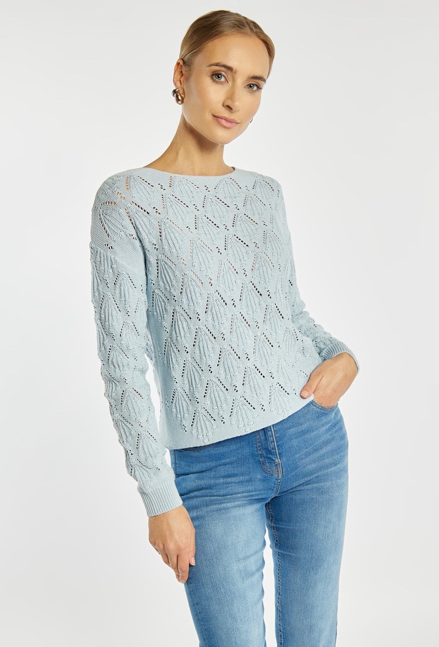 Ażurowy sweter o delikatnym, kobiecym splocie, który nadaje stylizacji lekkości. Model ma prosty krój i klasyczne ściągacze przy rękawach oraz u dołu, dzięki czemu dobrze układa się na sylwetce. Idealny na co dzień. Modelka na zdjęciu ma 177 cm wzrostu i prezentuje rozmiar S.