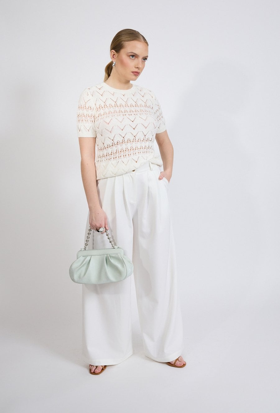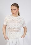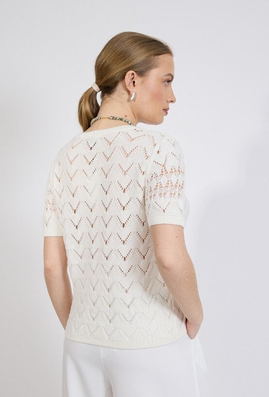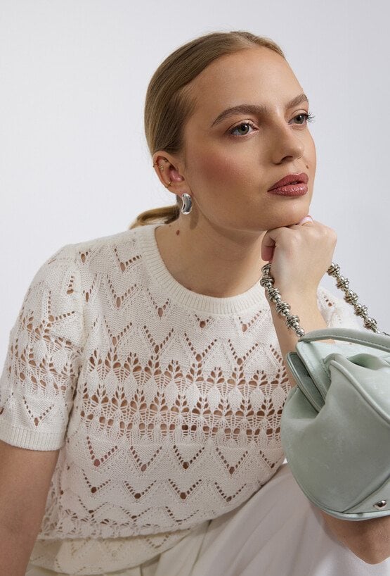 Sweter damski o dopasowanym, kobiecym kroju. Model z krótkim rękawem oraz klasycznym, zaokrąglonym dekoltem. Całość zdobi efektowny, ażurowy wzór o geometrycznym charakterze, który nadaje swetrowi lekkości i dekoracyjnego wyglądu. Damski sweter doskonale sprawdzi się w stylizacjach na cieplejsze dni. Świetnie prezentuje się w połączeniu ze spodniami materiałowymi, jeansami lub spódnicą, tworząc stylowy i kobiecy zestaw. Modelka na zdjęciu ma 177 cm wzrostu i prezentuje rozmiar S.