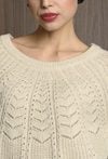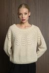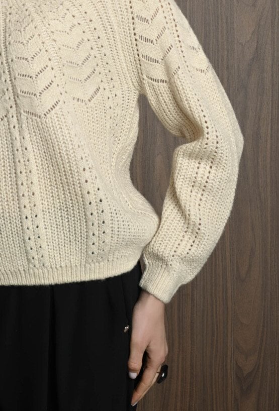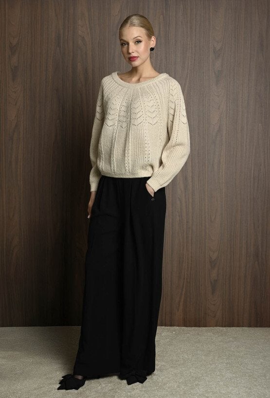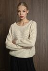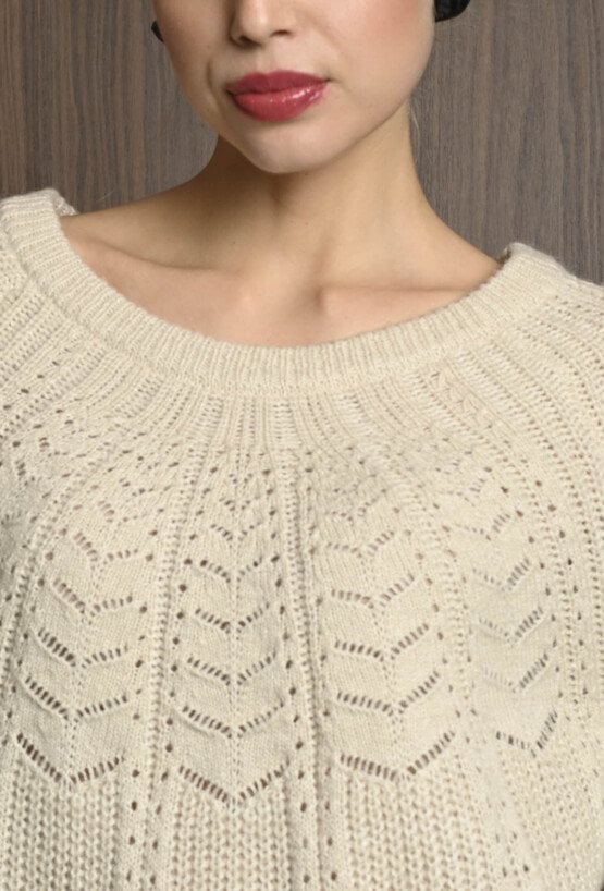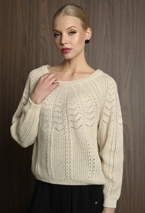 Miękki sweter z domieszką wełny, który łączy wygodę z oryginalnym wzorem dzianiny. Dekolt w łódkę nadaje swetrowi subtelny i klasyczny wygląd, podkreślając kobiecy styl. Idealny na co dzień i do bardziej wyjściowych stylizacji. Modelka na zdjęciu ma 177 cm wzrostu i prezentuje rozmiar 36.