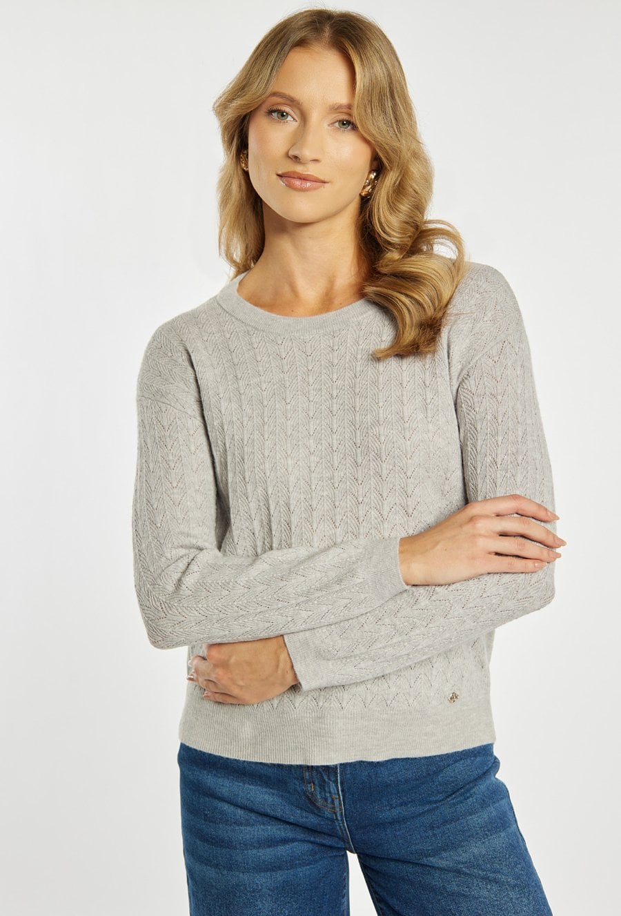 Sweter damski o klasycznym, ponadczasowym kroju. Model z długim rękawem oraz półokrągłym dekoltem. Delikatny, ażurowy splot w pionowe wzory nadaje całości subtelnego i eleganckiego charakteru. Damski sweter doskonale sprawdzi się w codziennych oraz bardziej stylowych stylizacjach. Modelka na zdjęciu ma 177 cm wzrostu i prezentuje rozmiar S/M.