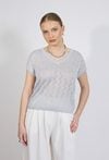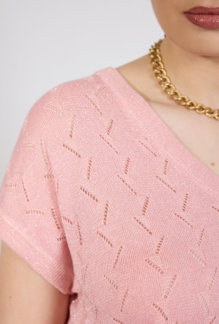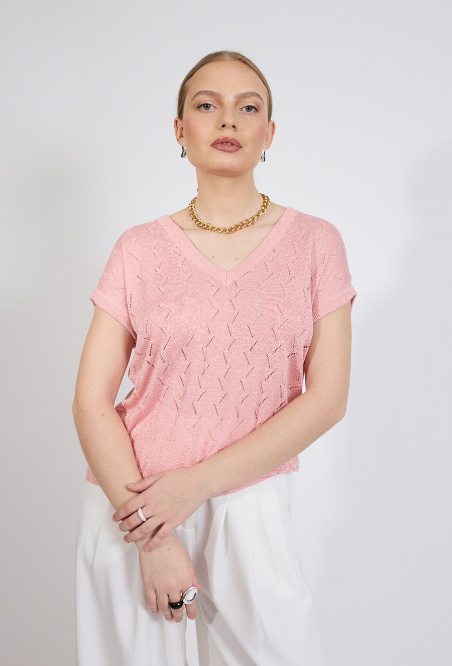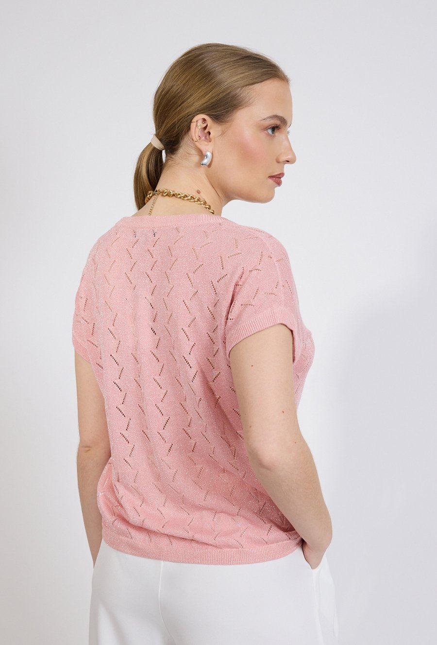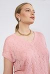 Sweter damski o lekkim, swobodnym kroju. Model z krótkim, luźnym rękawem oraz dekoltem w kształcie litery V, który subtelnie podkreśla linię szyi. Całość zdobi delikatny, ażurowy wzór o geometrycznym charakterze, nadający swetrowi lekkości i dekoracyjnego wyglądu. Modelka na zdjęciu ma 177 cm wzrostu i prezentuje rozmiar S.