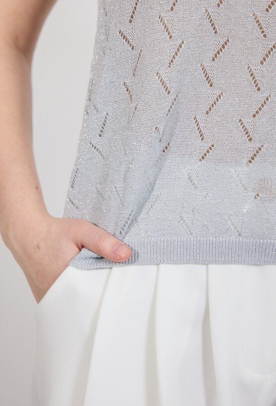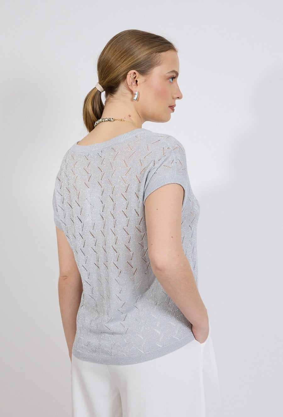 Sweter damski o lekkim, swobodnym kroju. Model z krótkim, luźnym rękawem oraz dekoltem w kształcie litery V, który subtelnie podkreśla linię szyi. Całość zdobi delikatny, ażurowy wzór o geometrycznym charakterze, nadający swetrowi lekkości i dekoracyjnego wyglądu. Modelka na zdjęciu ma 177 cm wzrostu i prezentuje rozmiar S.