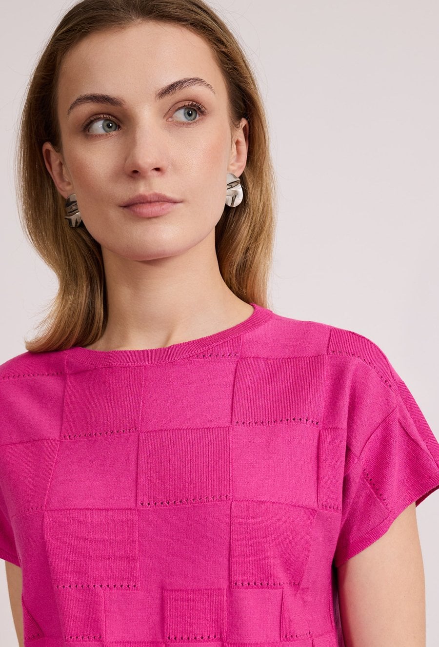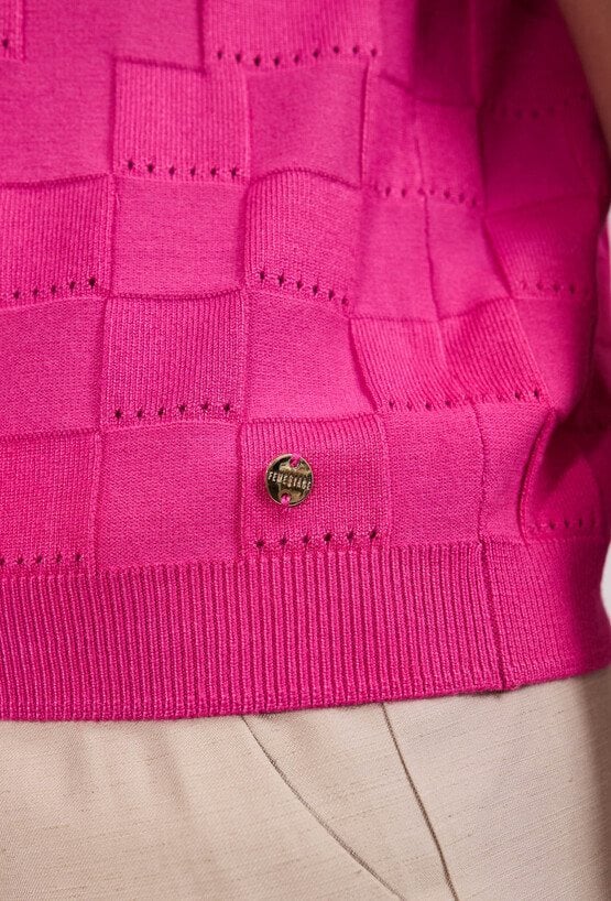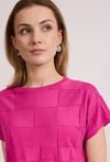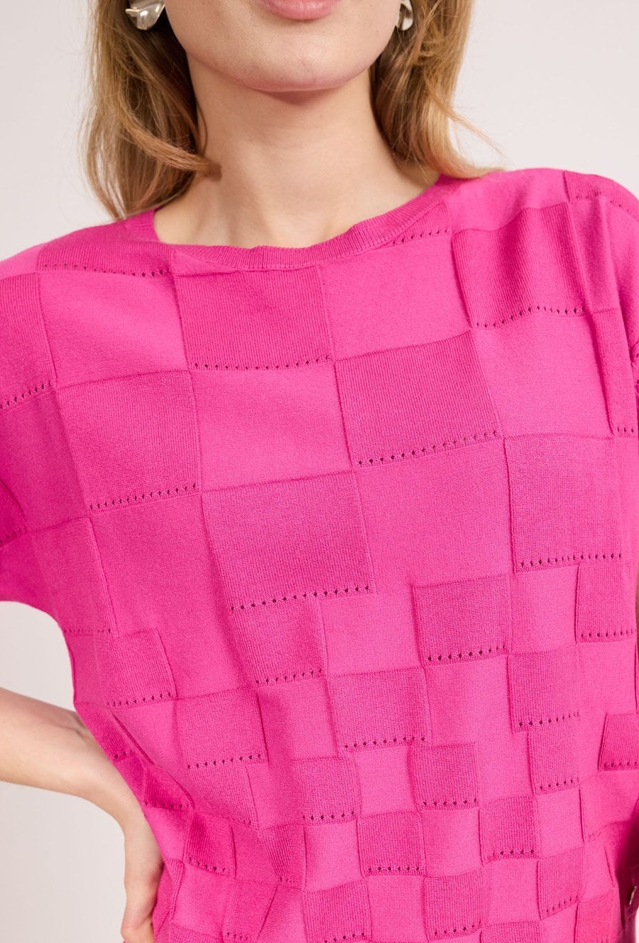Stylowy sweter damski o krótkim rękawie i luźnym kroju. Model z okrągłym dekoltem oraz efektowną, ażurową strukturą, która nadaje całości modnego i lekkiego charakteru. Sweter doskonale sprawdzi się w codziennych i letnich stylizacjach, zapewniając komfort i wygodę noszenia. Modelka na zdjęciu ma 177 cm wzrostu i prezentuje rozmiar S.