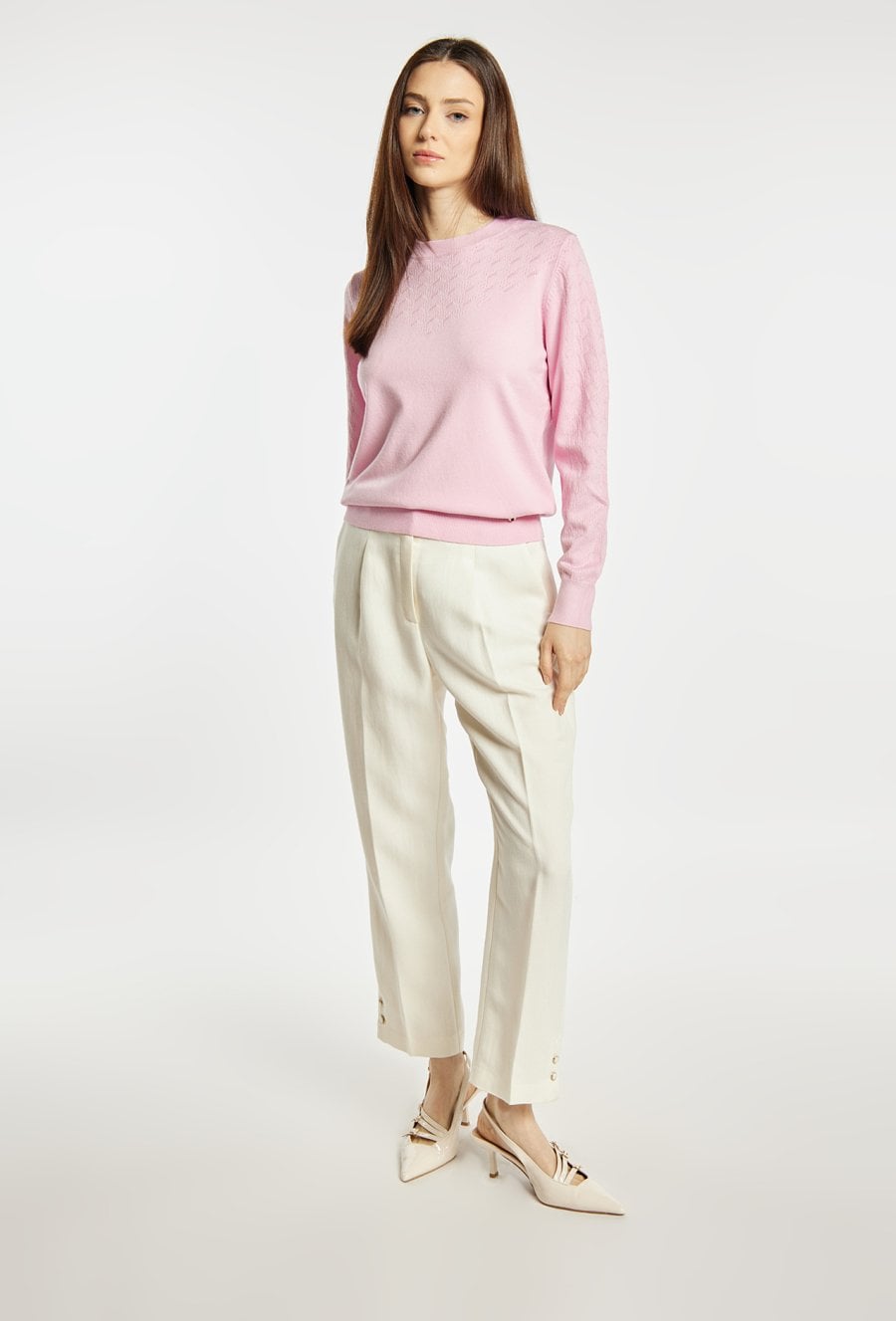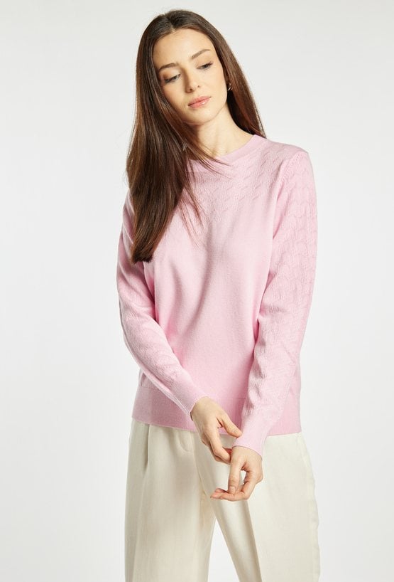 Sweter damski o klasycznym, eleganckim kroju. Model z długim rękawem oraz półokrągłym dekoltem. Subtelny, tłoczony wzór na przodzie i rękawach nadaje całości delikatnego, kobiecego charakteru. Damski sweter doskonale sprawdzi się w codziennych oraz bardziej eleganckich stylizacjach. Modelka na zdjęciu ma 177 cm wzrostu i prezentuje rozmiar S/M.