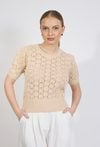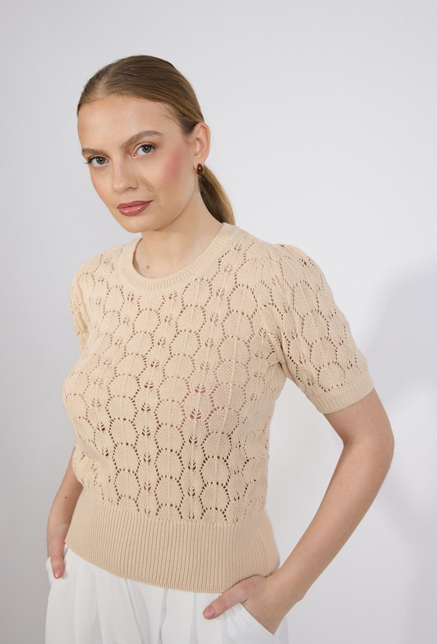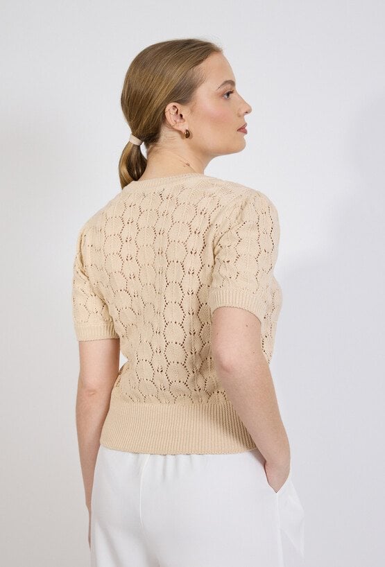 Sweter damski o dopasowanym, kobiecym kroju. Model z krótkim rękawem oraz klasycznym, zaokrąglonym dekoltem. Całość zdobi subtelny, ażurowy wzór o dekoracyjnym charakterze, który nadaje swetrowi lekkości i elegancji. Damski sweter doskonale sprawdzi się w stylizacjach na cieplejsze dni. Modelka na zdjęciu ma 177 cm wzrostu i prezentuje rozmiar S.