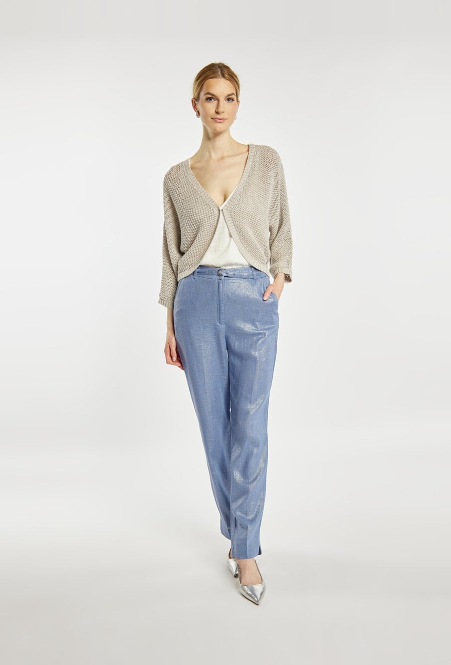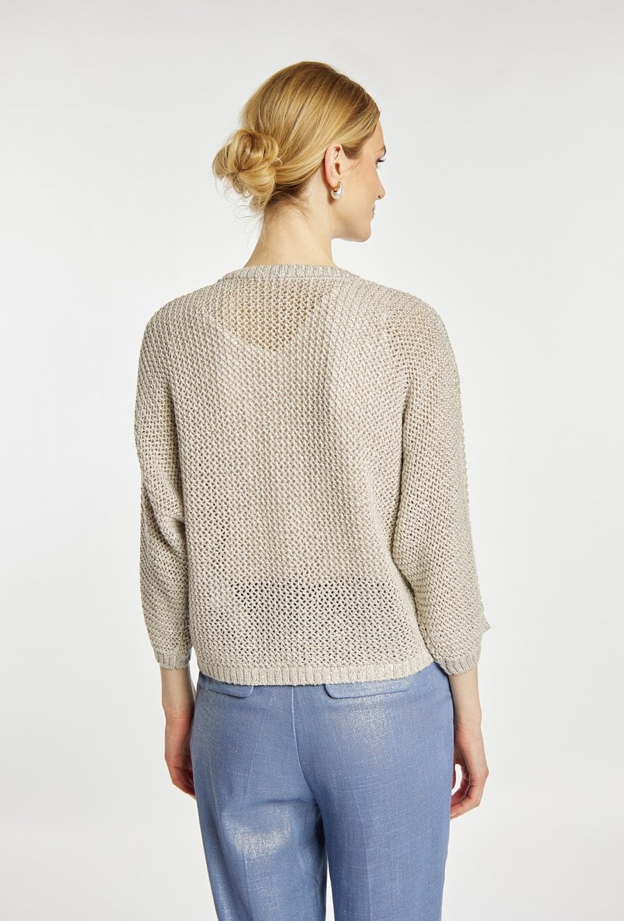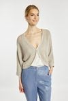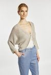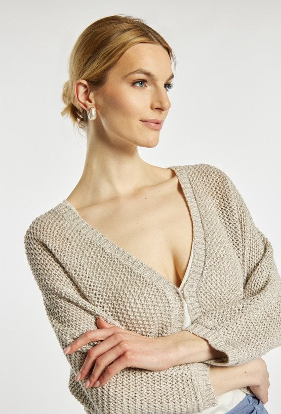 Sweter damski typu bolerko o luźnym, swobodnym kroju z rękawem o długości 3/4. Model z dekoltem w kształcie litery V oraz krótszym fasonem, który doskonale komponuje się z topami i sukienkami. Idealny jako stylowe uzupełnienie codziennych i bardziej eleganckich stylizacji. Modelka na zdjęciu ma 177 cm wzrostu i prezentuje rozmiar S.