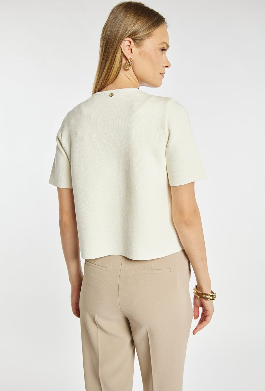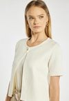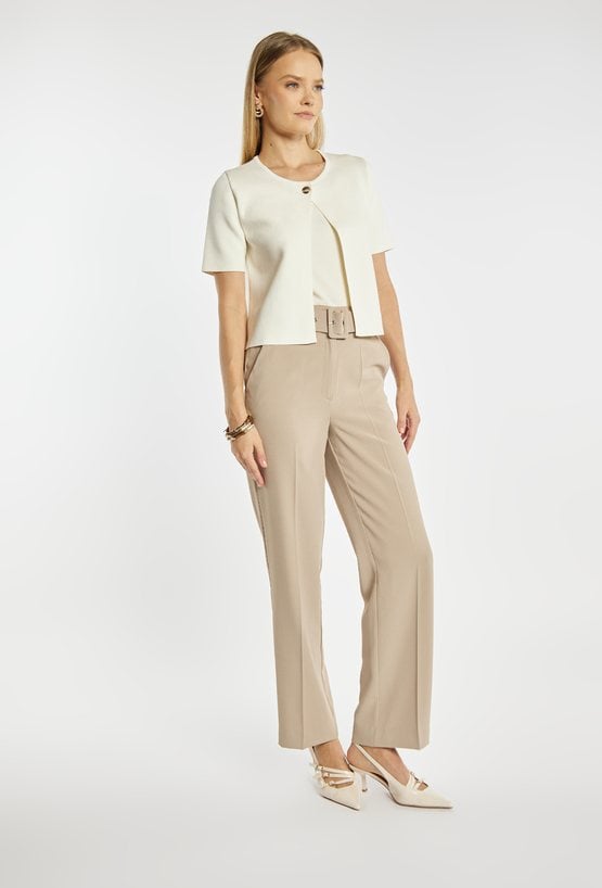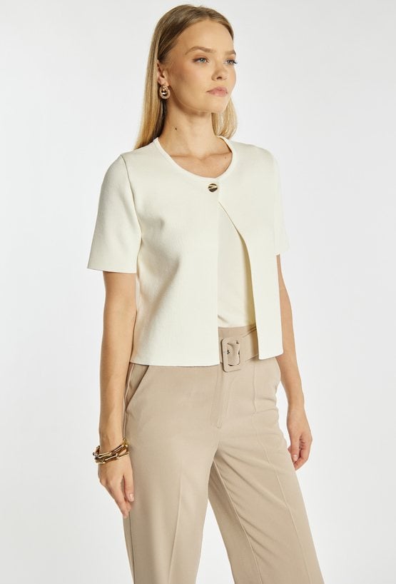 Sweter damski o dopasowanym kroju z krótkim rękawem. Model zapinany na guzik z okrągłym dekoltem, który nadaje całości eleganckiego i minimalistycznego charakteru. Sweter doskonale sprawdzi się w codziennych i bardziej formalnych stylizacjach, stanowiąc stylowe uzupełnienie garderoby. Modelka na zdjęciu ma 177 cm wzrostu i prezentuje rozmiar S.