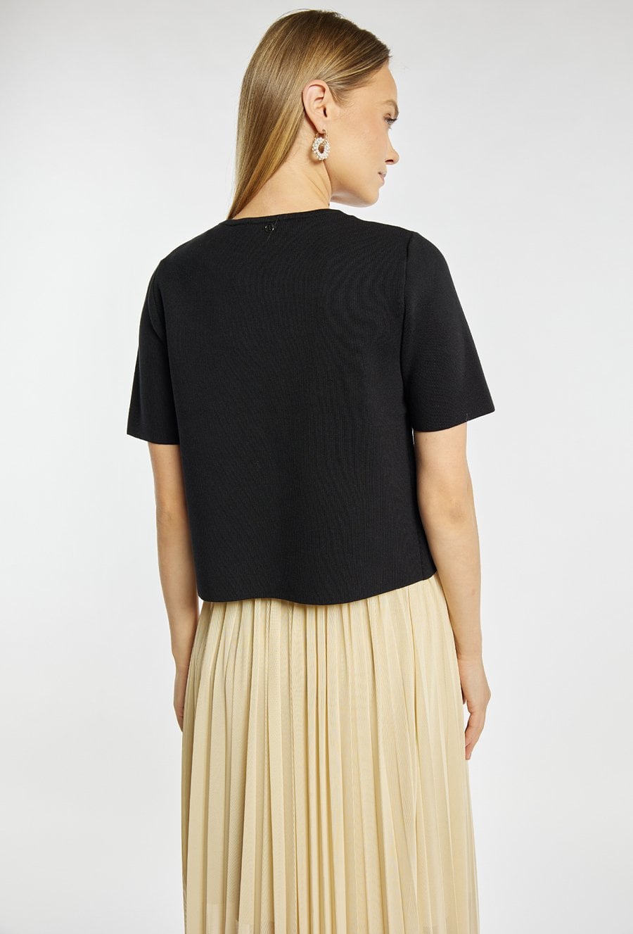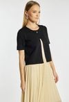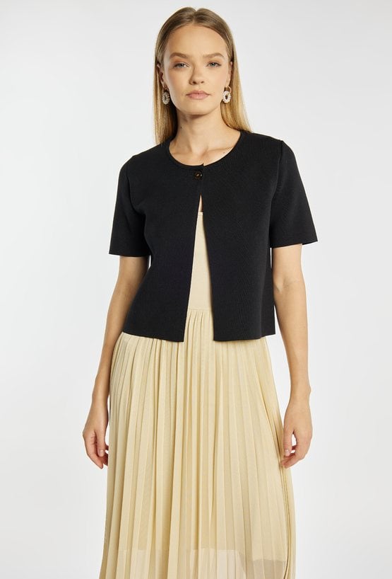 Sweter damski o dopasowanym kroju z krótkim rękawem. Model zapinany na guzik z okrągłym dekoltem, który nadaje całości eleganckiego i minimalistycznego charakteru. Sweter doskonale sprawdzi się w codziennych i bardziej formalnych stylizacjach, stanowiąc stylowe uzupełnienie garderoby. Modelka na zdjęciu ma 177 cm wzrostu i prezentuje rozmiar S.
