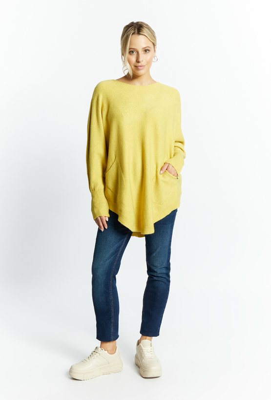 Asymetryczny sweter damski z dodatkiem wiskozy. Sweter z długimi rękawami, półokrągłym dekoltem oraz wpuszczanymi dwiema kieszonkami. Model ten z pewnością sprawdzi się w codziennych stylizacjach. Modelka na zdjęciu ma 177 cm wzrostu i prezentuje rozmiar S/M.