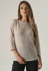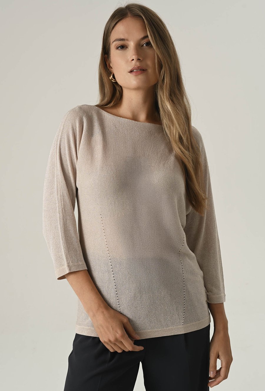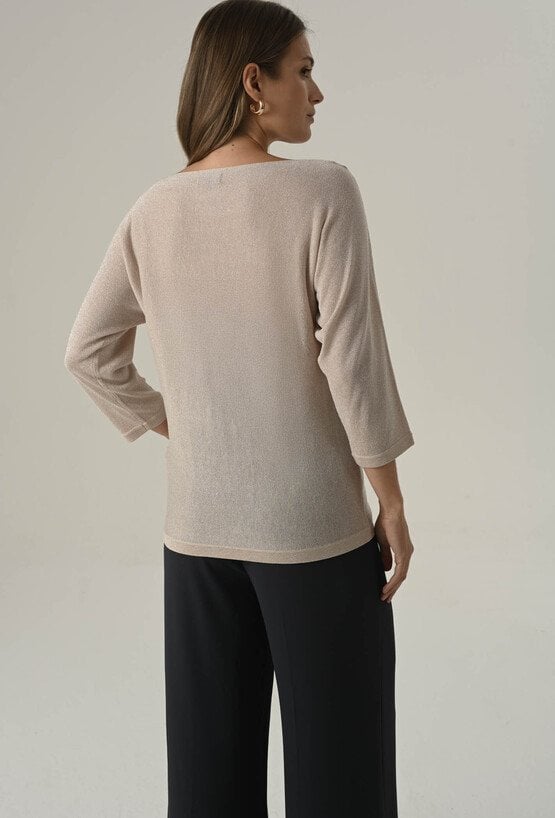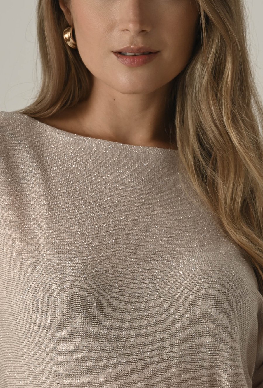 Miękki i wygodny, a przy tym z nutą elegancji – ten sweter z dekoltem w łódkę i rękawem 3/4 świetnie sprawdzi się na co dzień i na spotkania. Dzianina z przewagą wiskozy jest przyjemna dla skóry, a delikatna metaliczna nić dodaje mu wyjątkowego charakteru. Prosty fason, który z łatwością dopasujesz do jeansów, spódnicy lub eleganckich spodni. Modelka na zdjęciu ma 177 cm wzrostu i prezentuje rozmiar 36/S.