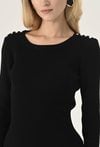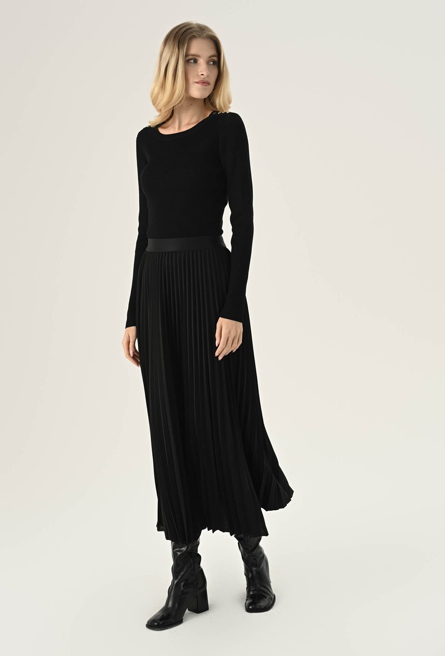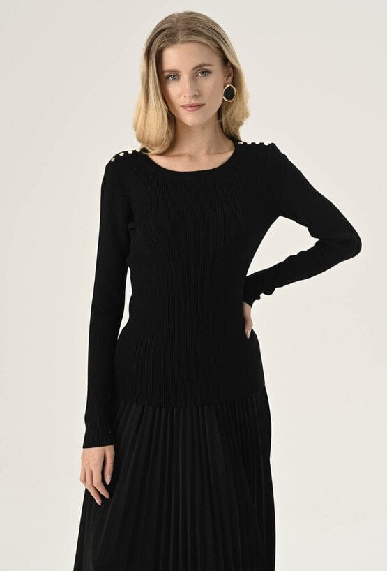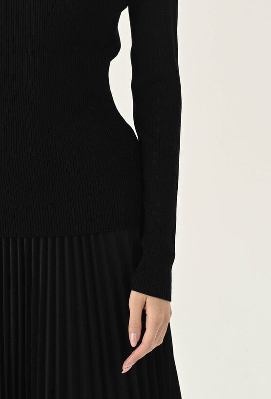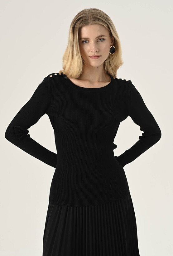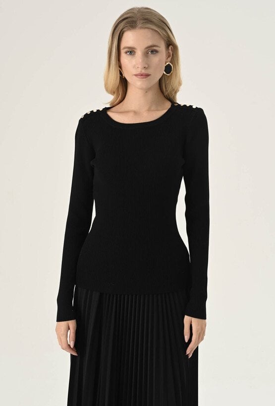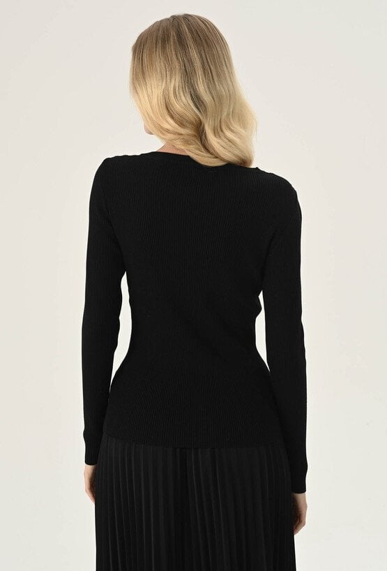 Sweter w kolorze klasycznej czerni z półokrągłym dekoltem i długimi rękawami. Wykonany z przyjemnej w dotyku wiskozy, zachwyca komfortem noszenia. Charakteru dodaje mu struktura w prążek. Model dostępny jest w kilku wariantach kolorystycznych. To uniwersalna propozycja, która świetnie sprawdzi się w wielu stylizacjach. Modelka na zdjęciu ma 177 cm wzrostu i prezentuje rozmiar S.