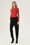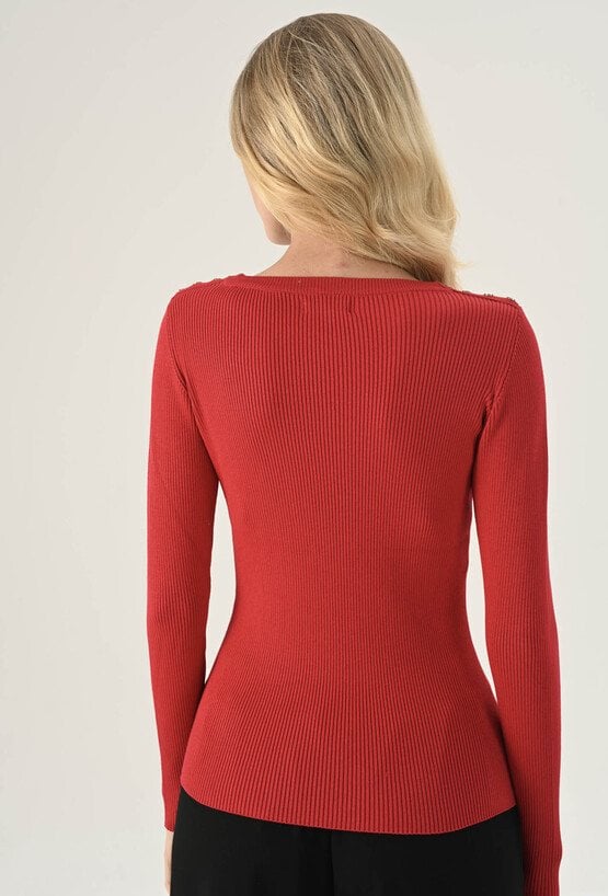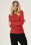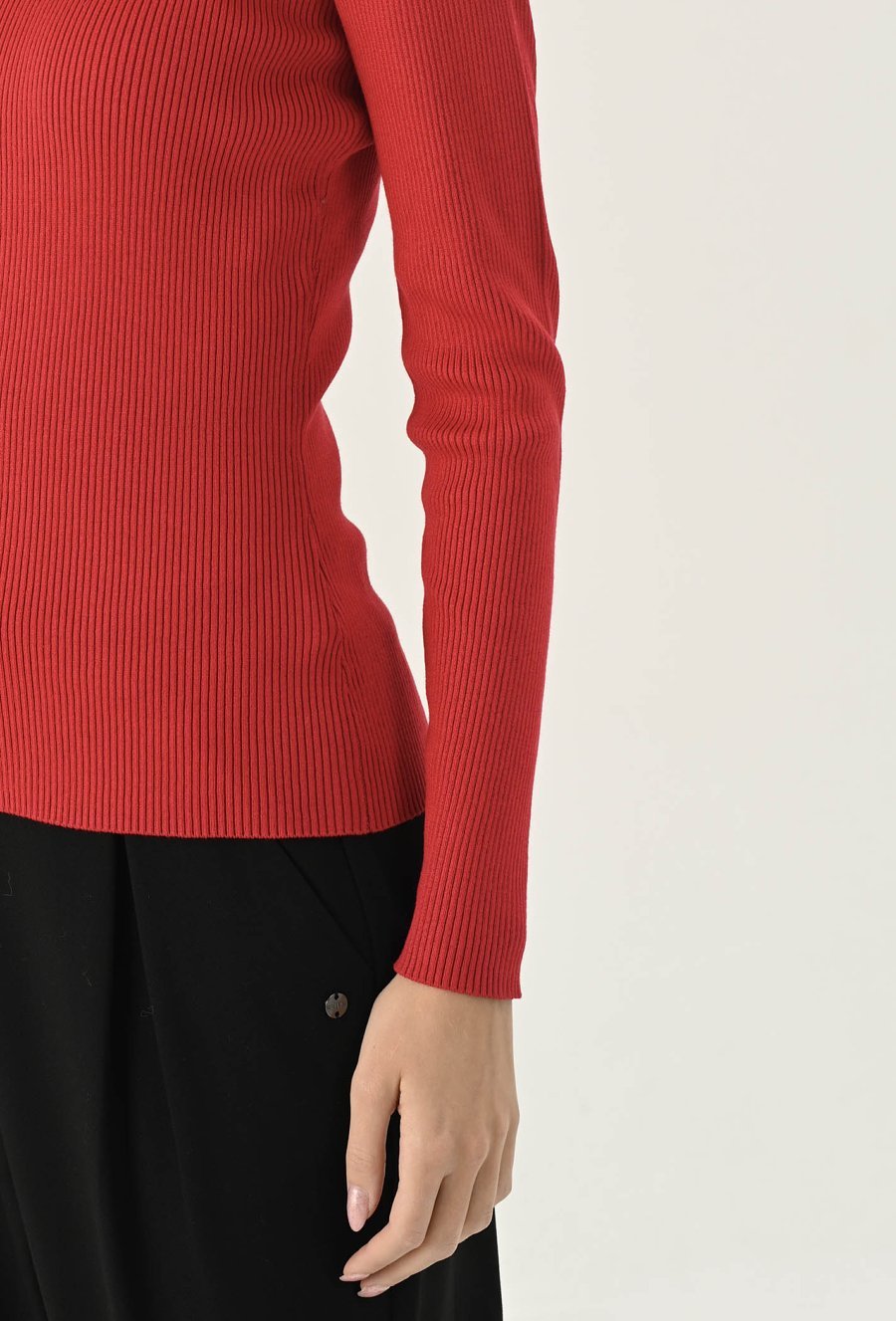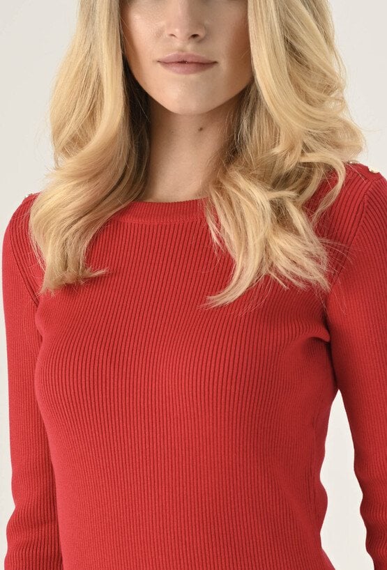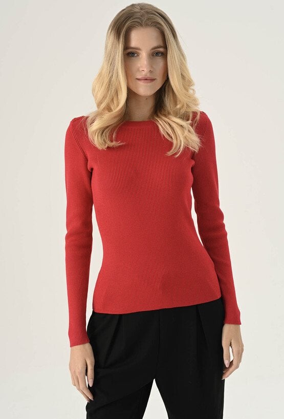 Sweter w kolorze ciepłej czerwieni z półokrągłym dekoltem i długimi rękawami. Wykonany z przyjemnej w dotyku wiskozy, zachwyca komfortem noszenia. Charakteru dodaje mu struktura w prążek. Model dostępny jest w kilku wariantach kolorystycznych. To uniwersalna propozycja, która świetnie sprawdzi się w wielu stylizacjach. Modelka na zdjęciu ma 177 cm wzrostu i prezentuje rozmiar S.