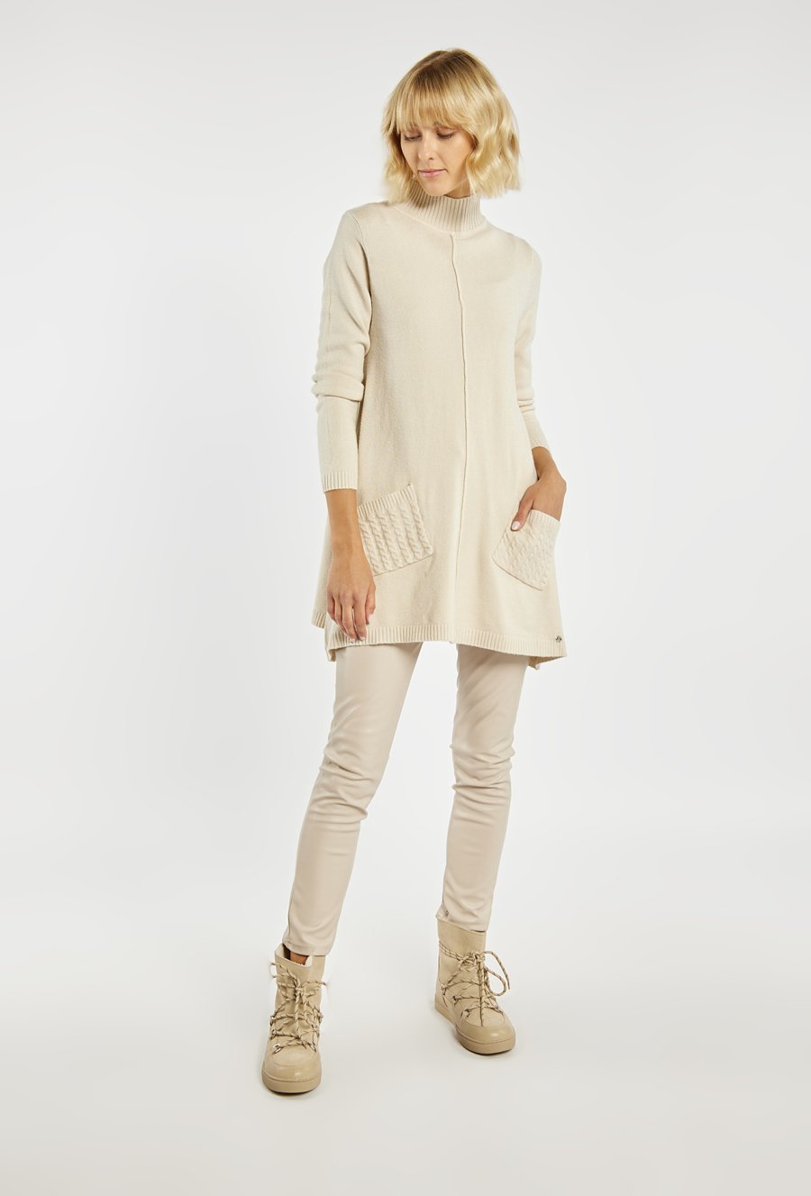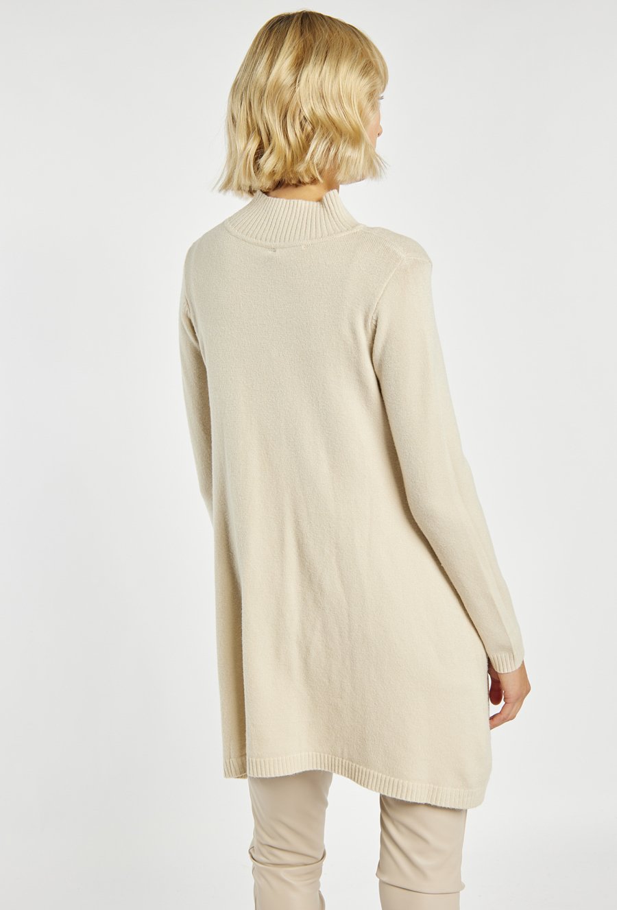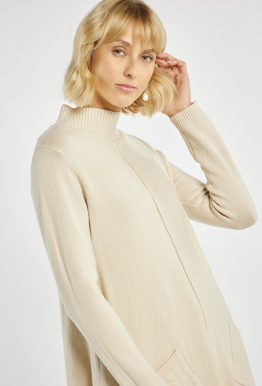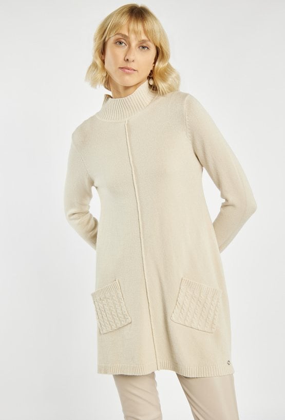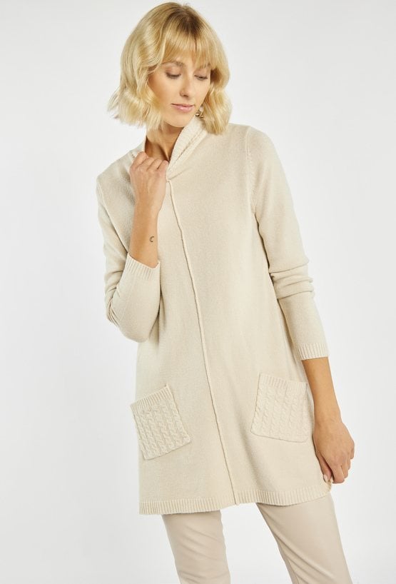 Długi sweter z ozdobnym przeszyciem z przodu i praktycznymi kieszeniami. Sweter idealny na chłodniejsze dni. Luźny krój zapewnia wygodę, a subtelne detale dodają mu eleganckiego charakteru. Modelka na zdjęciu ma 177 cm wzrostu i prezentuje rozmiar S/M.
