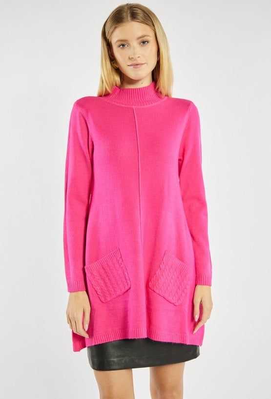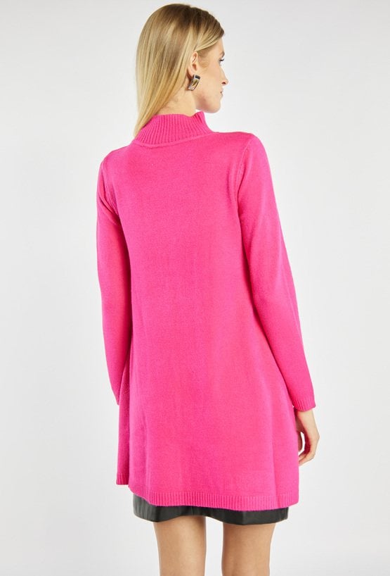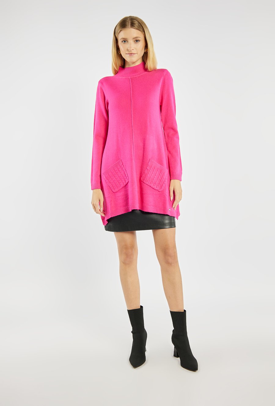Długi sweter z ozdobnym przeszyciem z przodu i praktycznymi kieszeniami. Sweter idealny na chłodniejsze dni. Luźny krój zapewnia wygodę, a subtelne detale dodają mu eleganckiego charakteru. Modelka na zdjęciu ma 177 cm wzrostu i prezentuje rozmiar S/M.