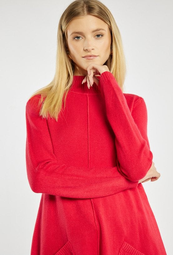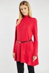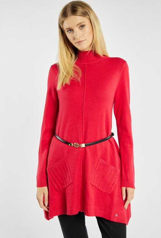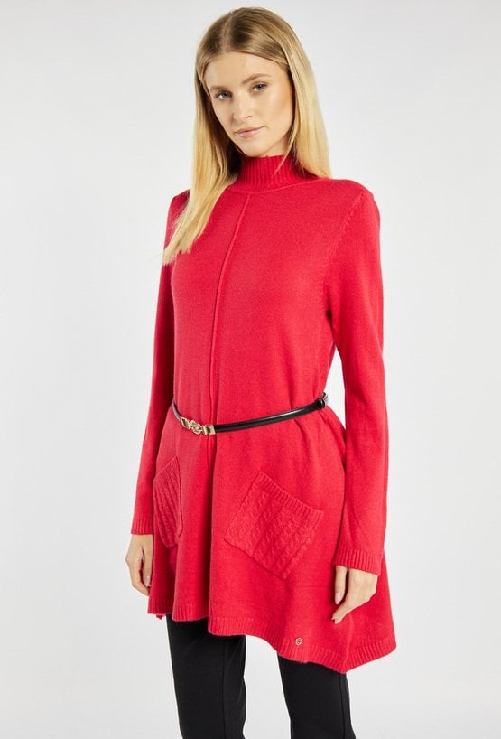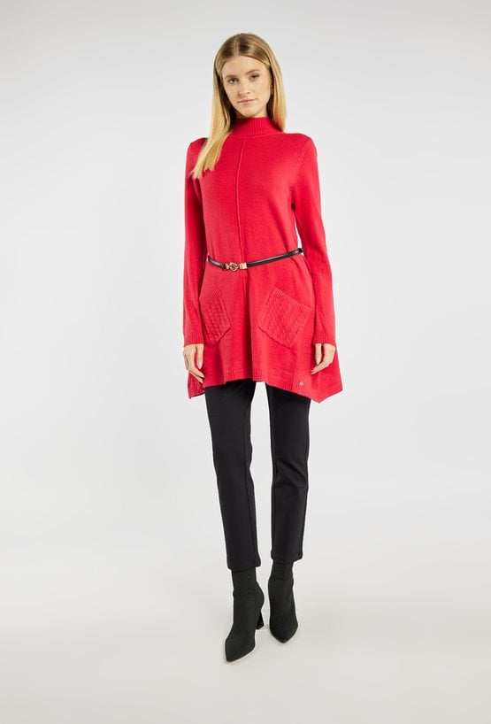 Długi sweter z ozdobnym przeszyciem z przodu i praktycznymi kieszeniami. Sweter idealny na chłodniejsze dni. Luźny krój zapewnia wygodę, a subtelne detale dodają mu eleganckiego charakteru. Modelka na zdjęciu ma 177 cm wzrostu i prezentuje rozmiar S/M.