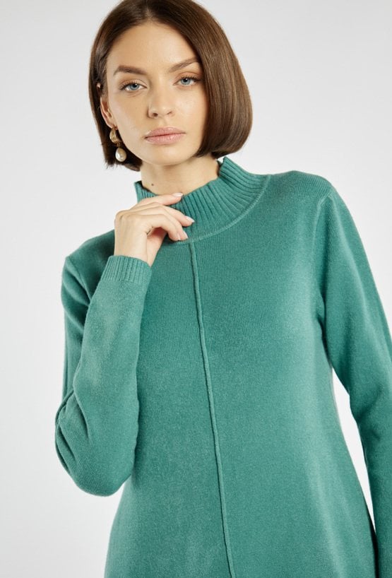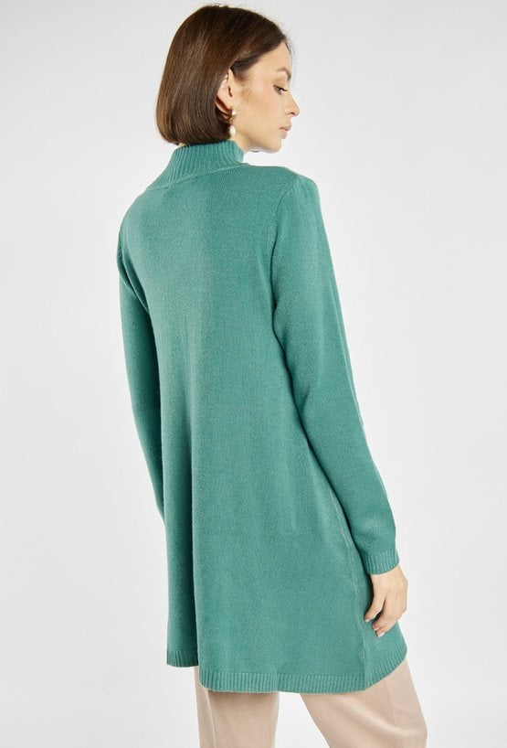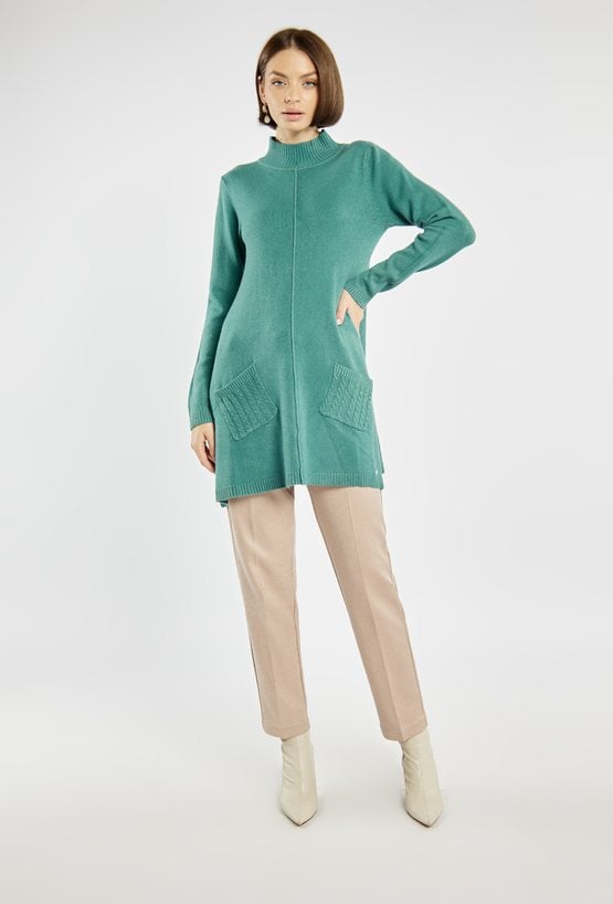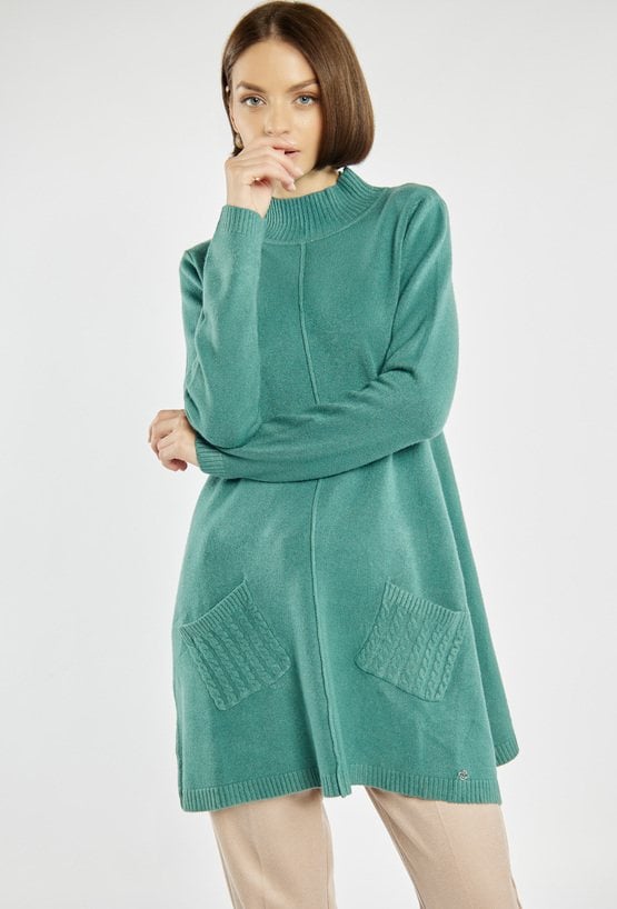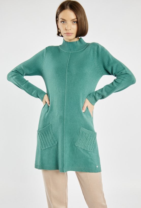 Długi sweter z ozdobnym przeszyciem z przodu i praktycznymi kieszeniami. Sweter idealny na chłodniejsze dni. Luźny krój zapewnia wygodę, a subtelne detale dodają mu eleganckiego charakteru. Modelka na zdjęciu ma 177 cm wzrostu i prezentuje rozmiar S/M.