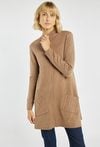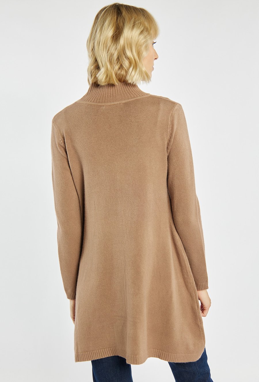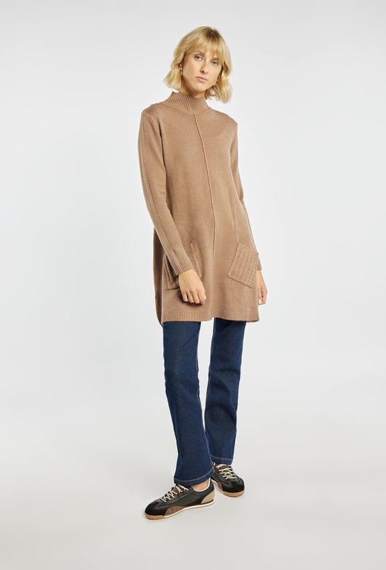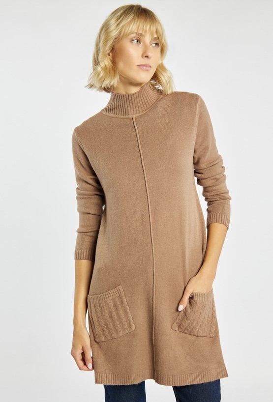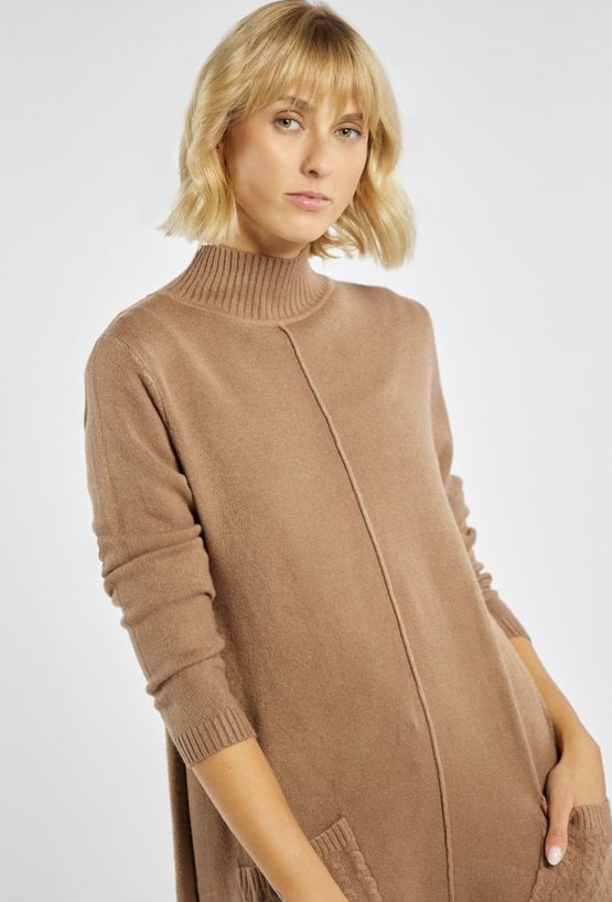 Długi sweter z ozdobnym przeszyciem z przodu i praktycznymi kieszeniami. Sweter idealny na chłodniejsze dni. Luźny krój zapewnia wygodę, a subtelne detale dodają mu eleganckiego charakteru. Modelka na zdjęciu ma 177 cm wzrostu i prezentuje rozmiar S/M.
