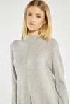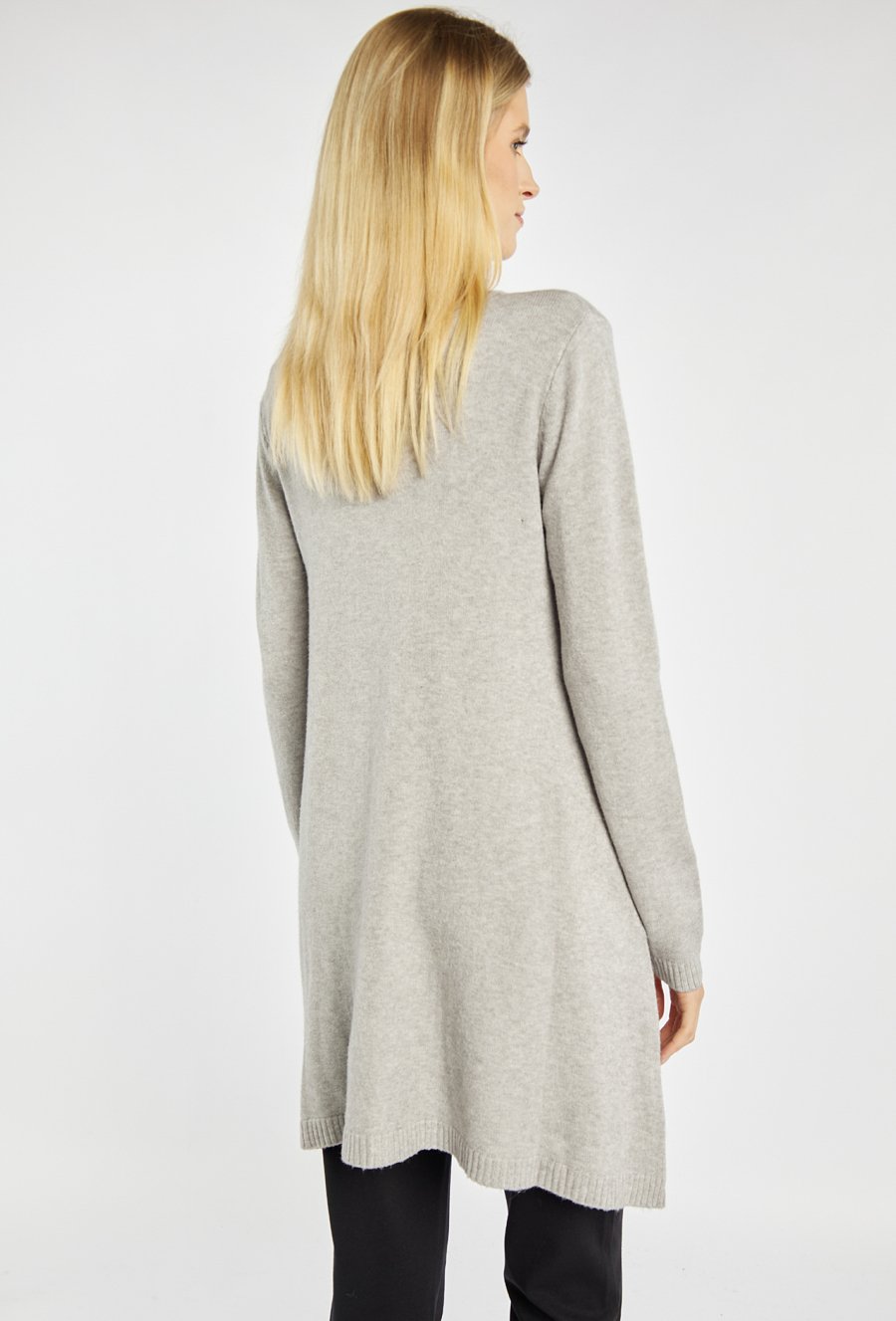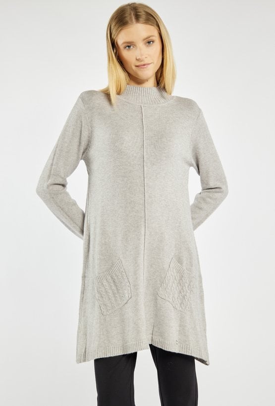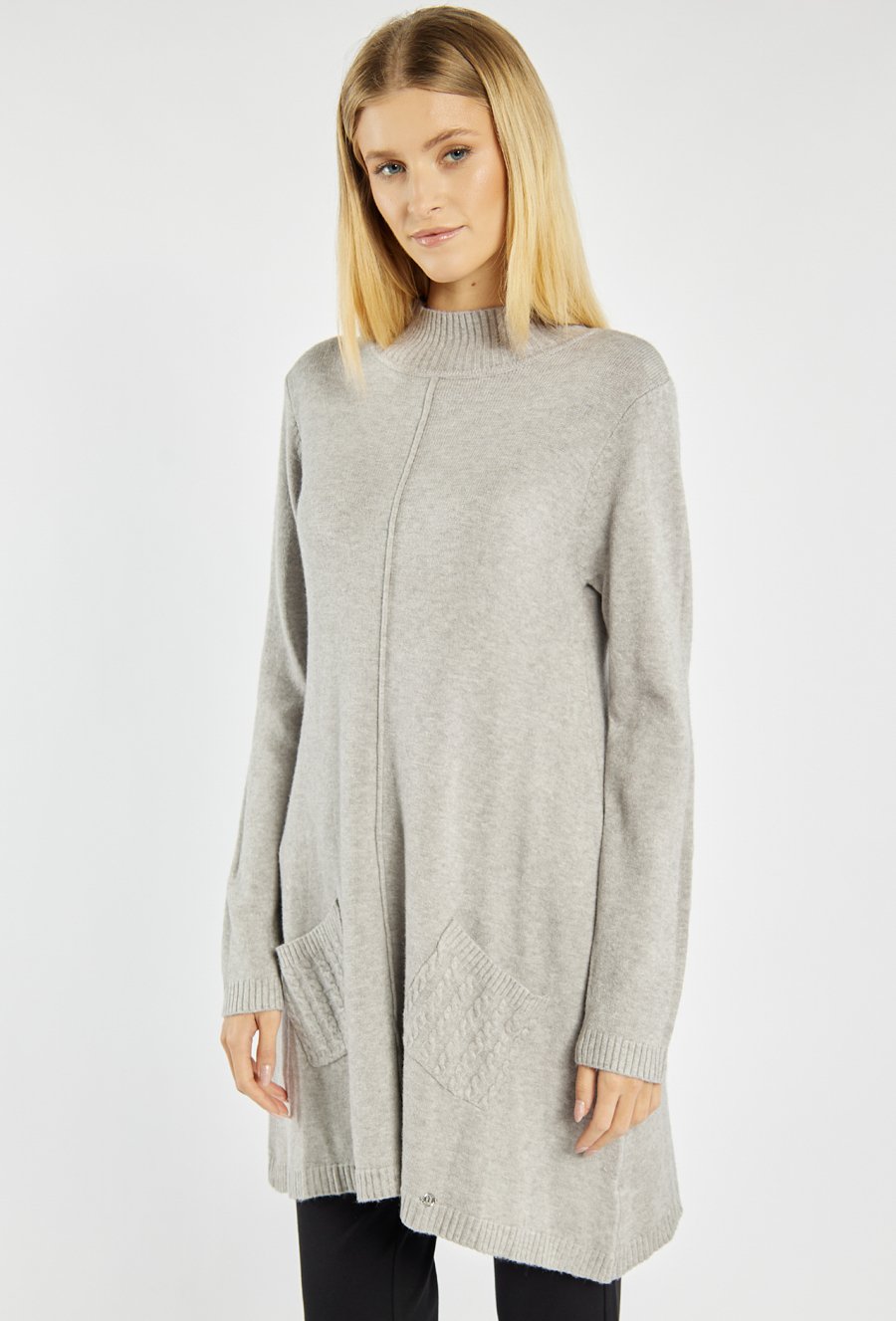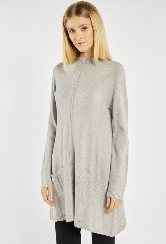 Długi sweter z ozdobnym przeszyciem z przodu i praktycznymi kieszeniami. Sweter idealny na chłodniejsze dni. Luźny krój zapewnia wygodę, a subtelne detale dodają mu eleganckiego charakteru. Modelka na zdjęciu ma 177 cm wzrostu i prezentuje rozmiar S/M.